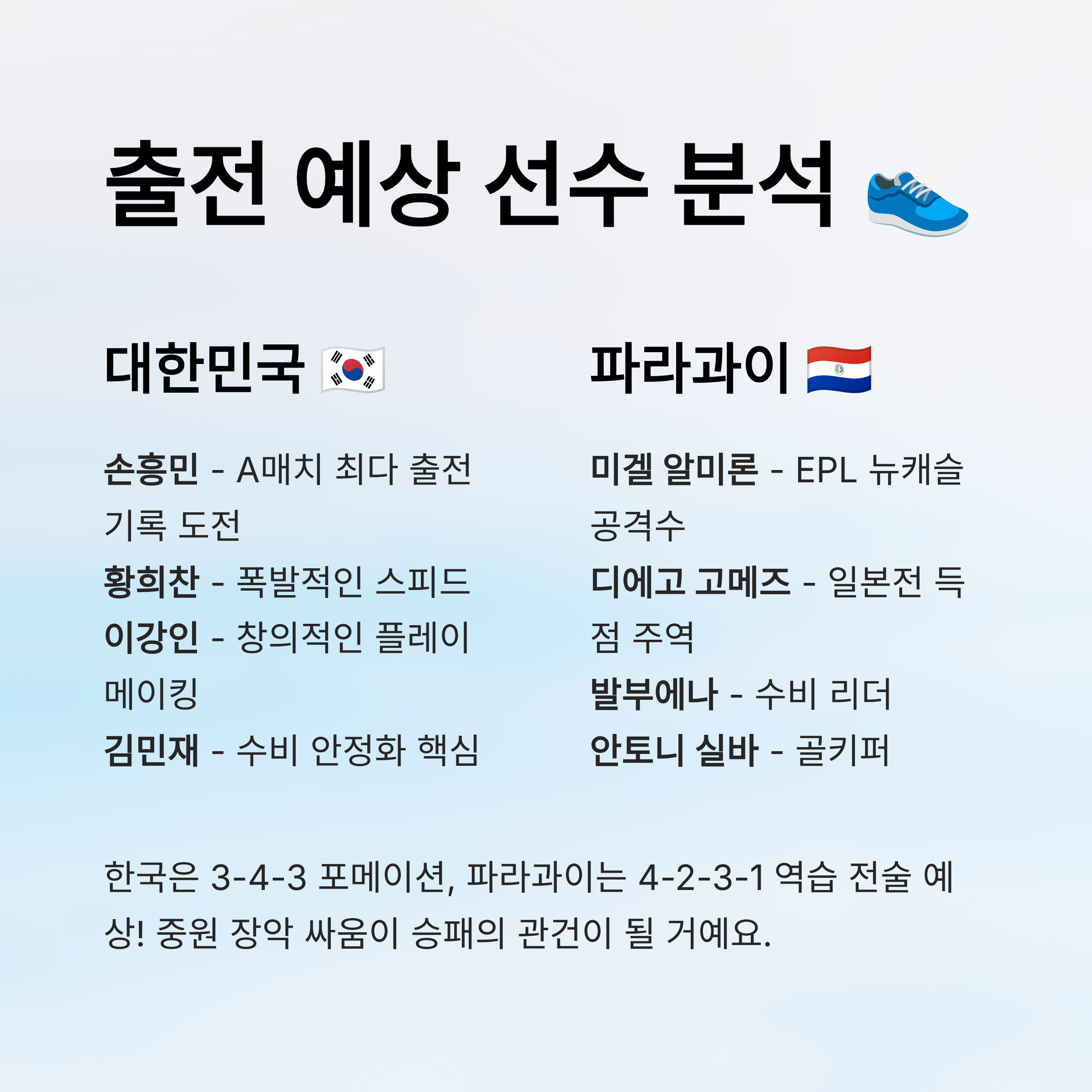 한국은 3-4-3 혹은 3-5-2 포메이션을 중심으로 실험할 가능성이 있고, 파라과이는 4-2-3-1 혹은 4-4-2 형태로 역습 중심의 전술을 들고 나올 것으로 예상돼요. 전술적인 충돌도 이 경기의 재미 포인트 중 하나예요.
