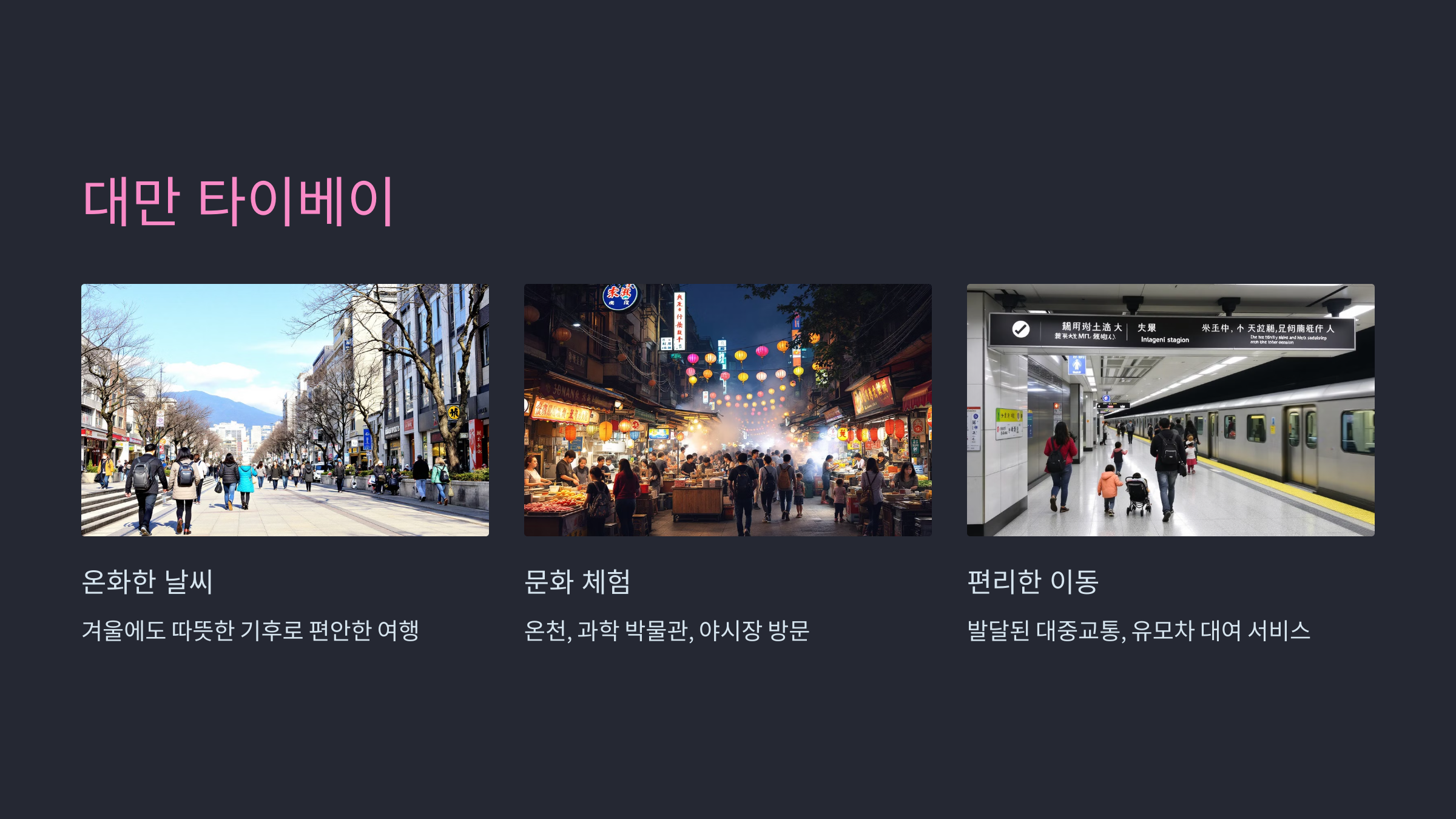타이베이는 겨울에도 온화한 날씨와 다채로운 체험을 즐길 수 있는 가족 여행지입니다. 아이들과 함께 자연 속 온천을 즐기거나, 야시장에서 현지 음식을 맛보는 특별한 시간을 가져보세요.