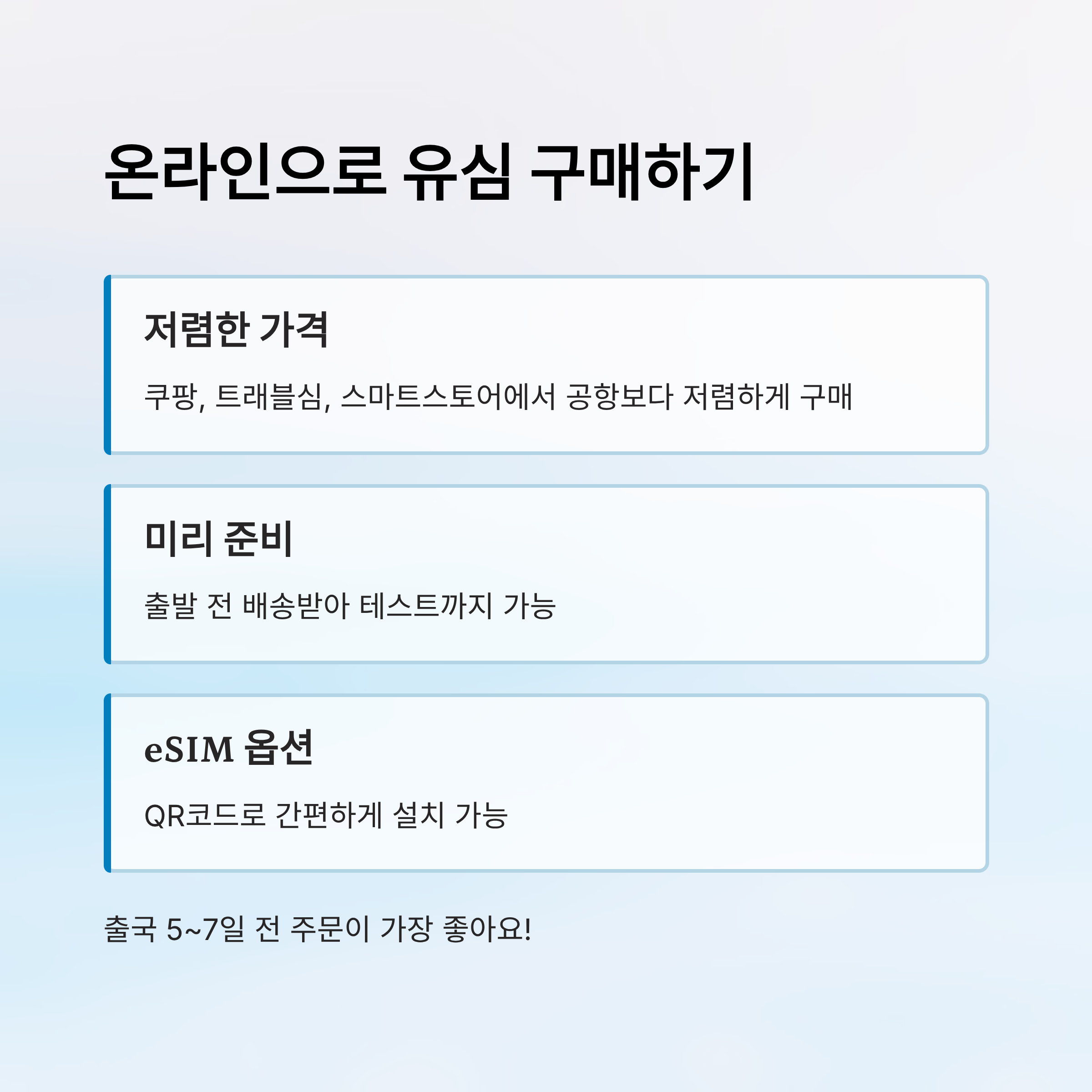 A1. 출국 5~7일 전에 온라인으로 구매하면 가장 저렴하고 배송 여유도 있어요. 급할 경우 공항에서 바로 사는 것도 가능하지만 가격은 조금 더 비싸요.