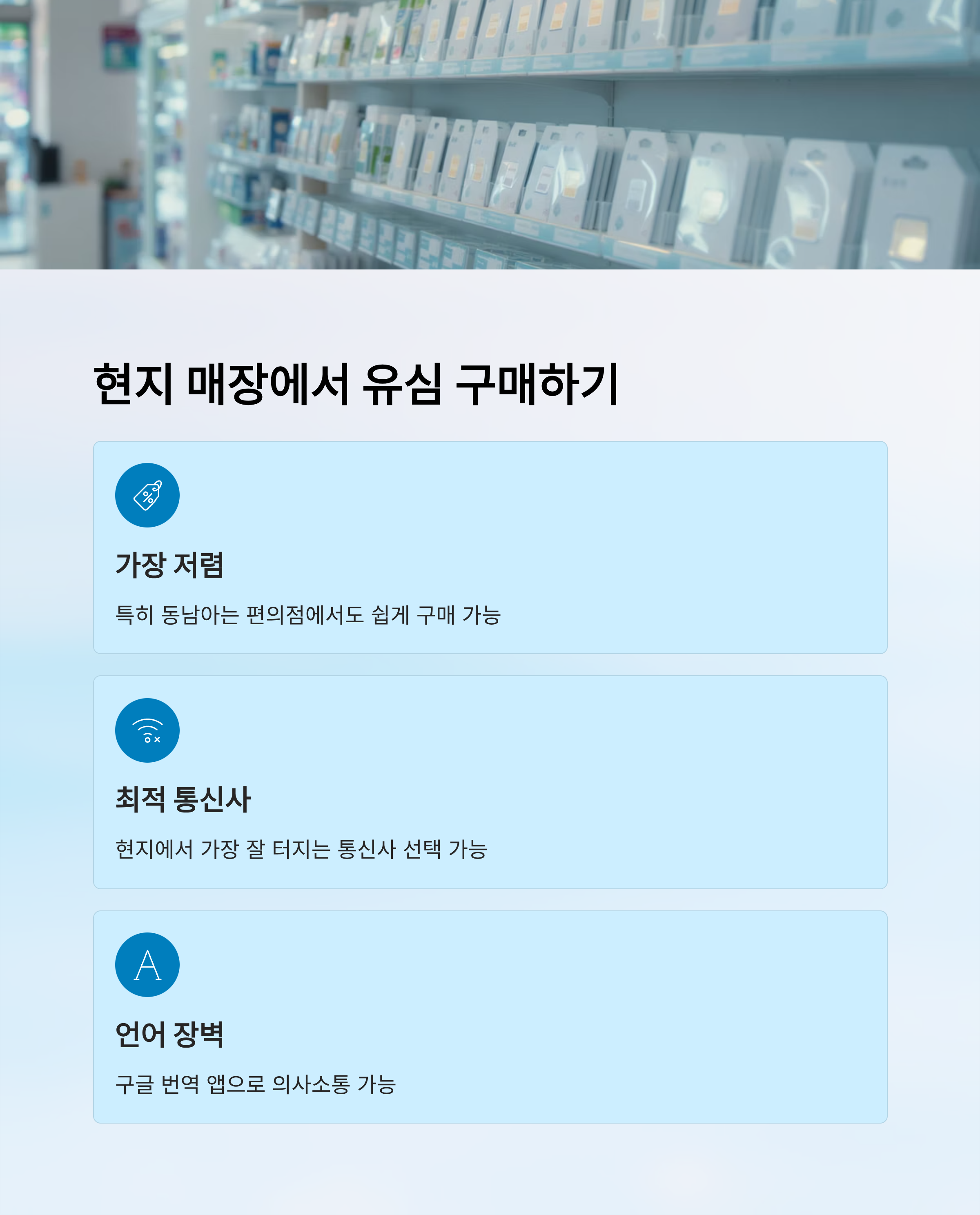 현지 매장은 저렴하고 다양한 유심이 있지만, 언어가 부담이라면 사진 번역 앱을 꼭 활용해보세요. 직접 비교해보고 고를 수 있어서 알뜰한 여행자에게 딱이에요! 📶