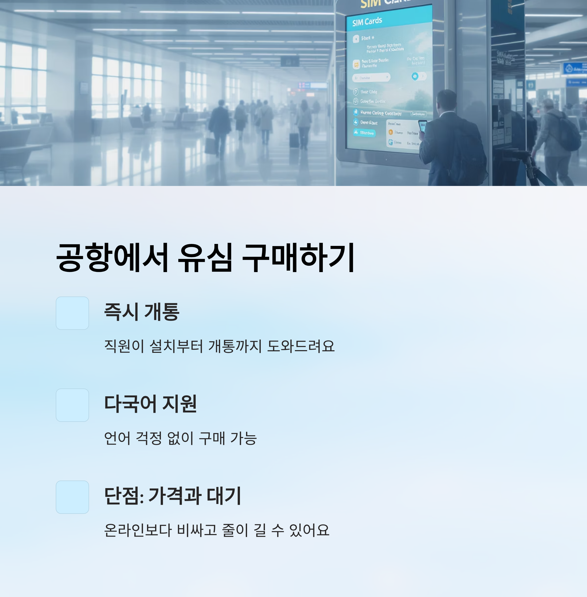 단점은 인기 노선의 경우 긴 줄이 생기거나 유심이 품절되는 경우가 있다는 점이에요. 그리고 특정 통신사만 고를 수 있어서 선택지가 제한될 수 있어요. 출국 전에 공항 내 위치를 미리 파악해두는 것도 좋아요.