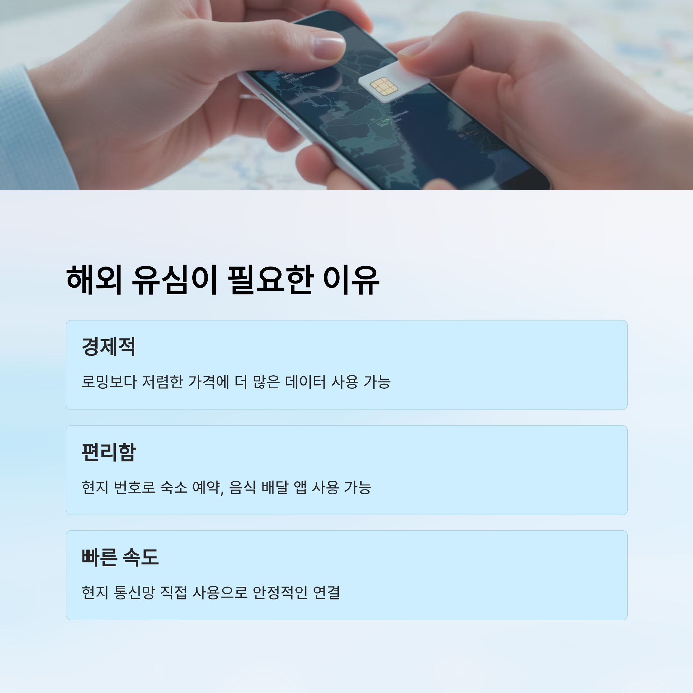 요즘 해외여행 갈 때, 공항 와이파이만 믿고 다니기엔 너무 불안하죠? 📵 해외 유심은 현지에서 빠르게 인터넷을 쓰고, 구글 맵이나 메시징 앱을 활용할 수 있게 해주는 필수템이에요.