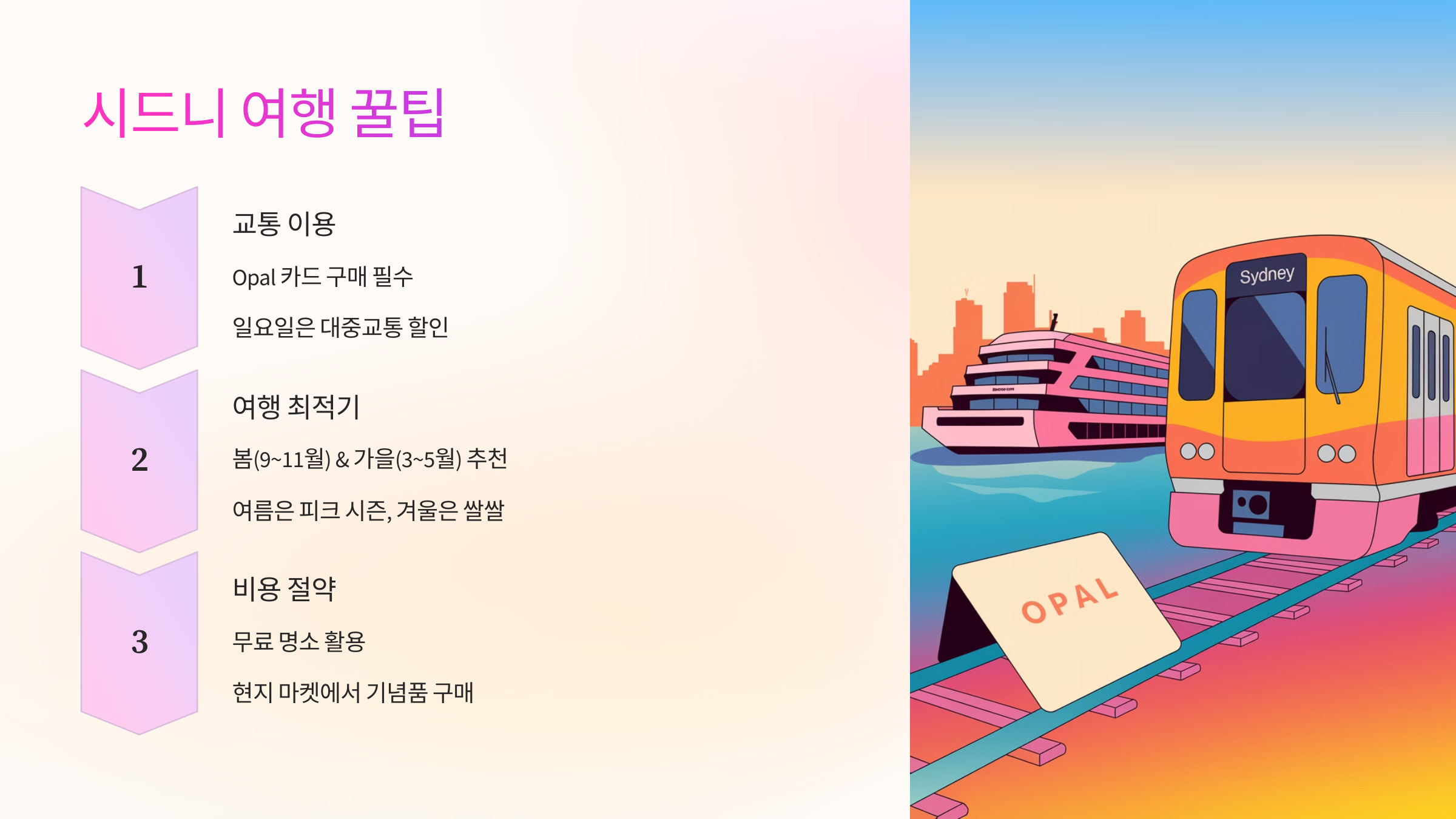시드니 여행을 더욱 편하고 즐겁게 만들 **꿀팁**을 정리했어요! 🇦🇺✨ 교통, 날씨, 여행 비용 절약 방법까지 모두 알려드릴게요. 😊