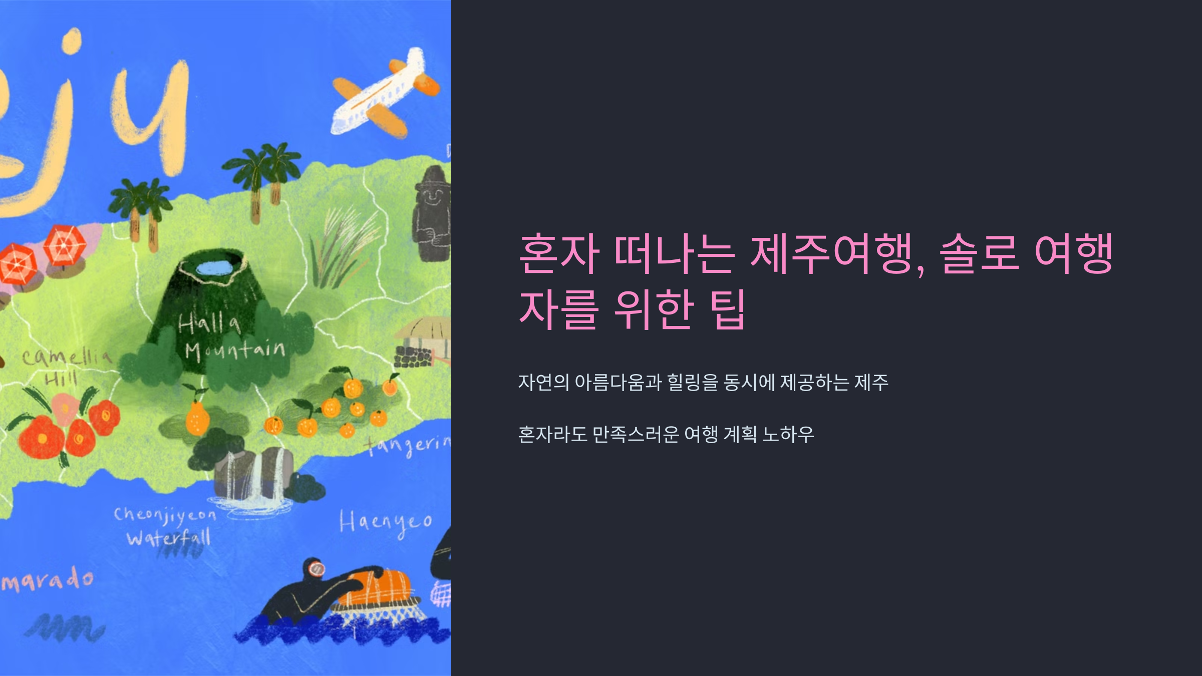 제주는 자연과 도시가 조화롭게 공존하는 여행지로, 혼자서도 여유롭고 편안한 여행을 즐길 수 있는 곳입니다.