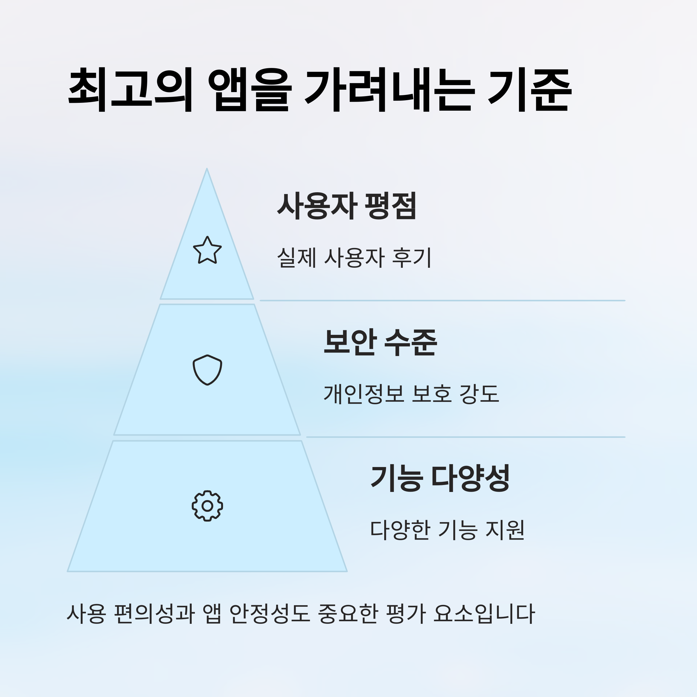 이번에 소개할 TOP5 앱은 단순히 다운로드 수만 보고 정한 게 아니에요! 실제 사용 경험을 바탕으로 다음 5가지 기준을 설정하고, 그 점수를 종합해서 가장 안정적이고 유용한 앱을 골랐어요.