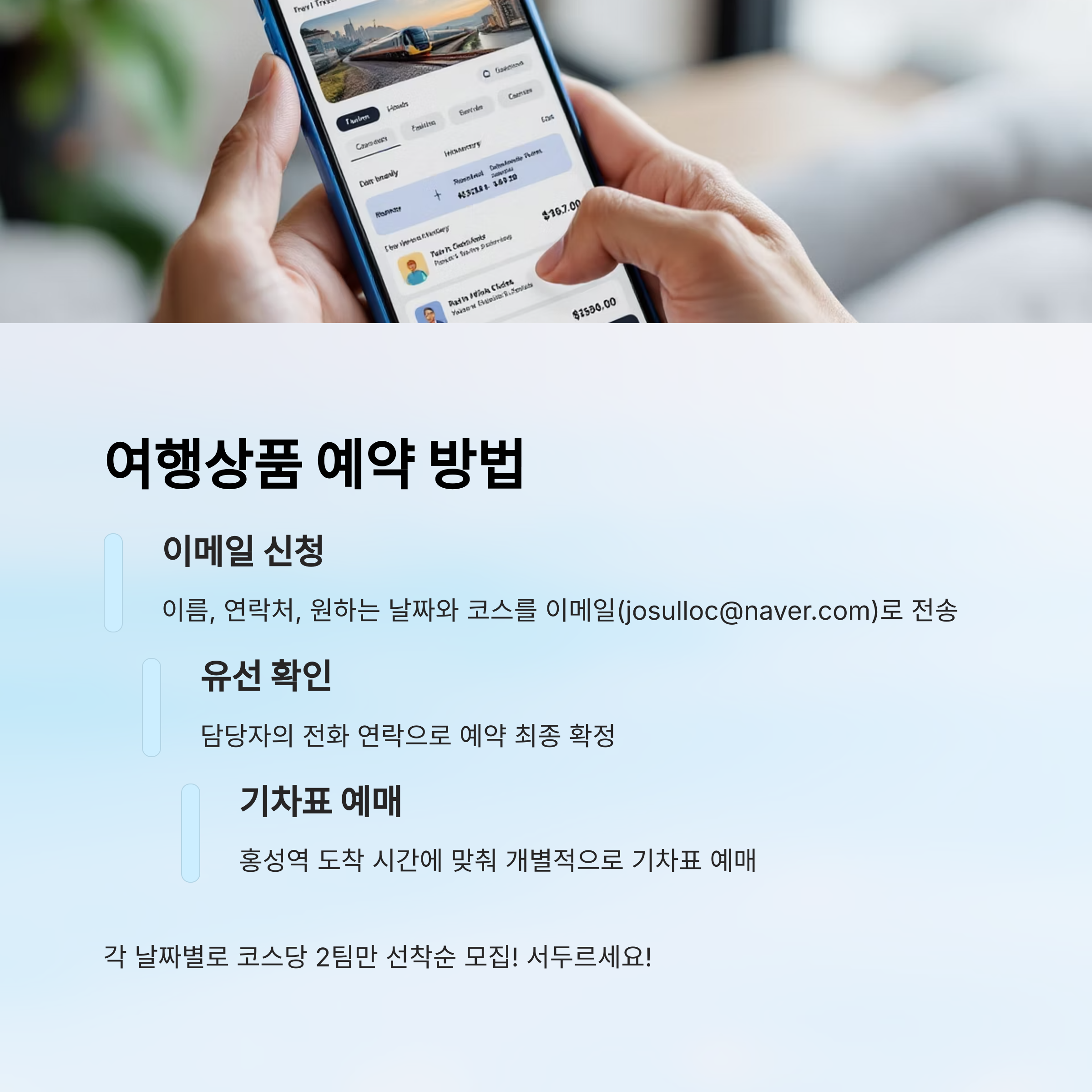 홍성 무공해 당일치기 여행상품 ‘홍·당·무’는 예약이 정말 간단해요! 복잡한 회원가입도 필요 없이, 이메일 한 통이면 예약 끝이에요. ✉️