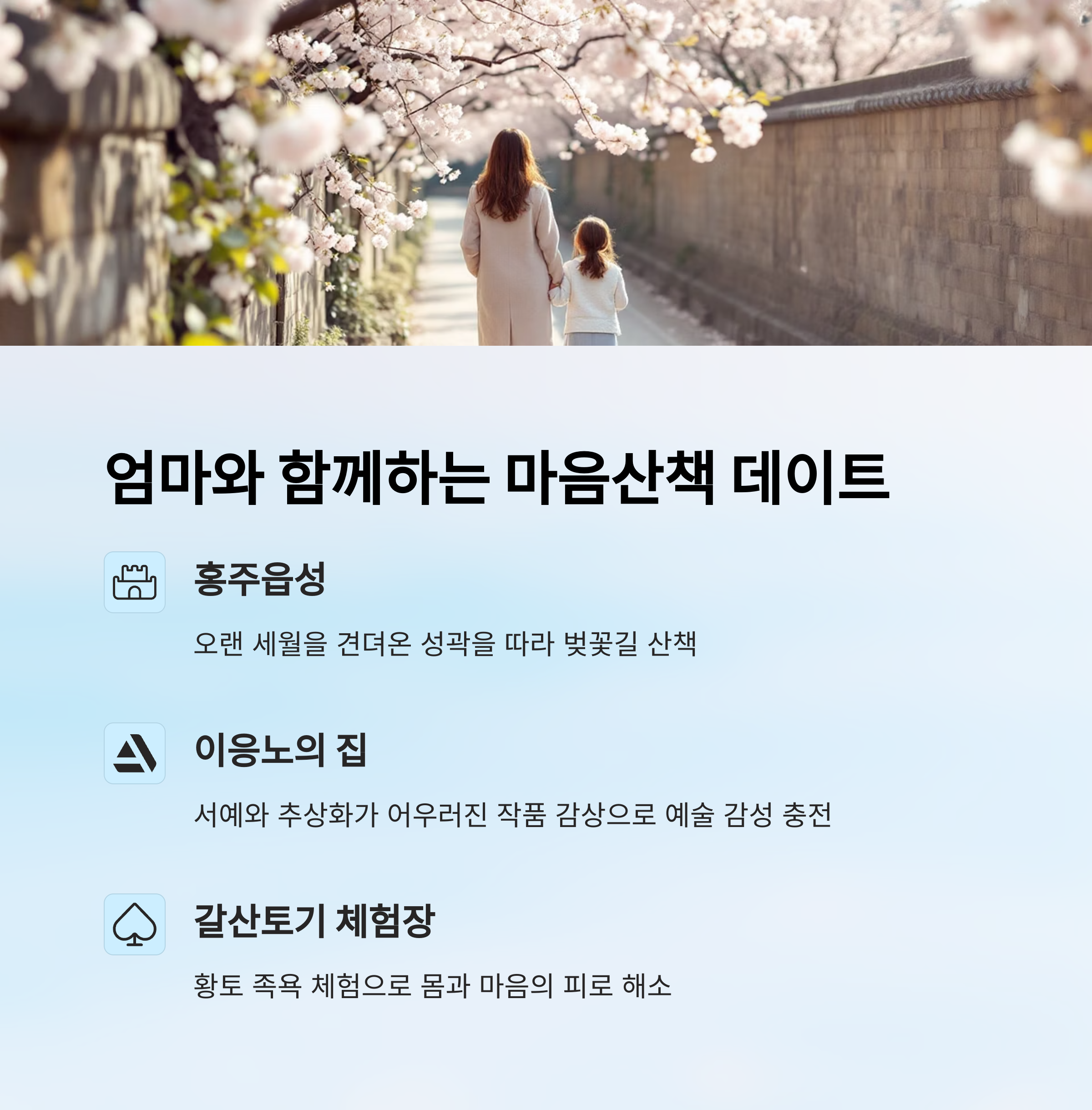 이 코스는 몸과 마음이 모두 편안해지는 힐링여행이라서, 특히 일상에 지친 엄마와 딸이 함께 떠나면 더 특별한 시간이 될 거예요.