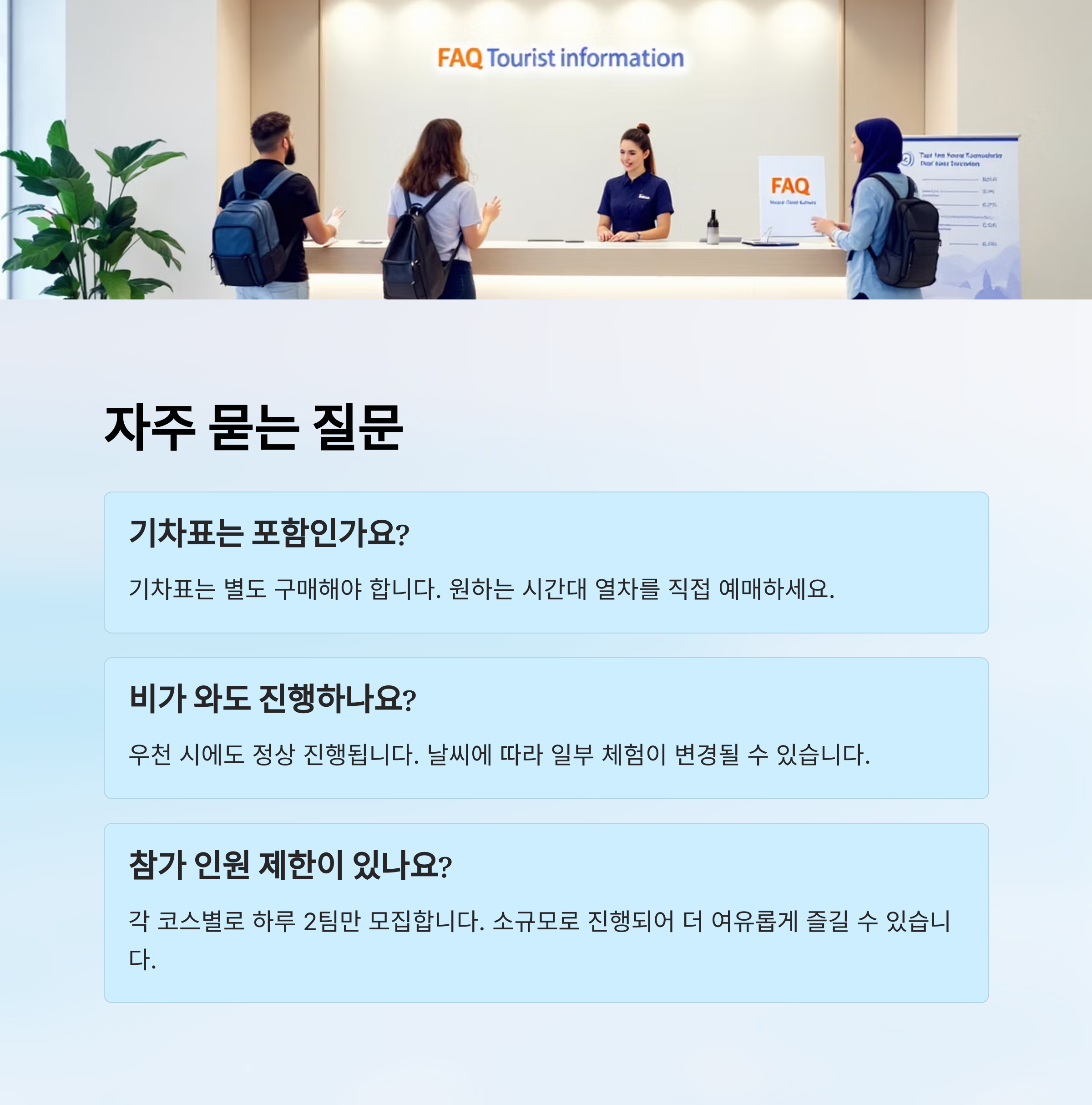 A8. 각 코스별로 하루 2팀만 모집하고 있어요. 소규모로 진행되기 때문에 더 여유롭고 안전하게 즐길 수 있답니다.