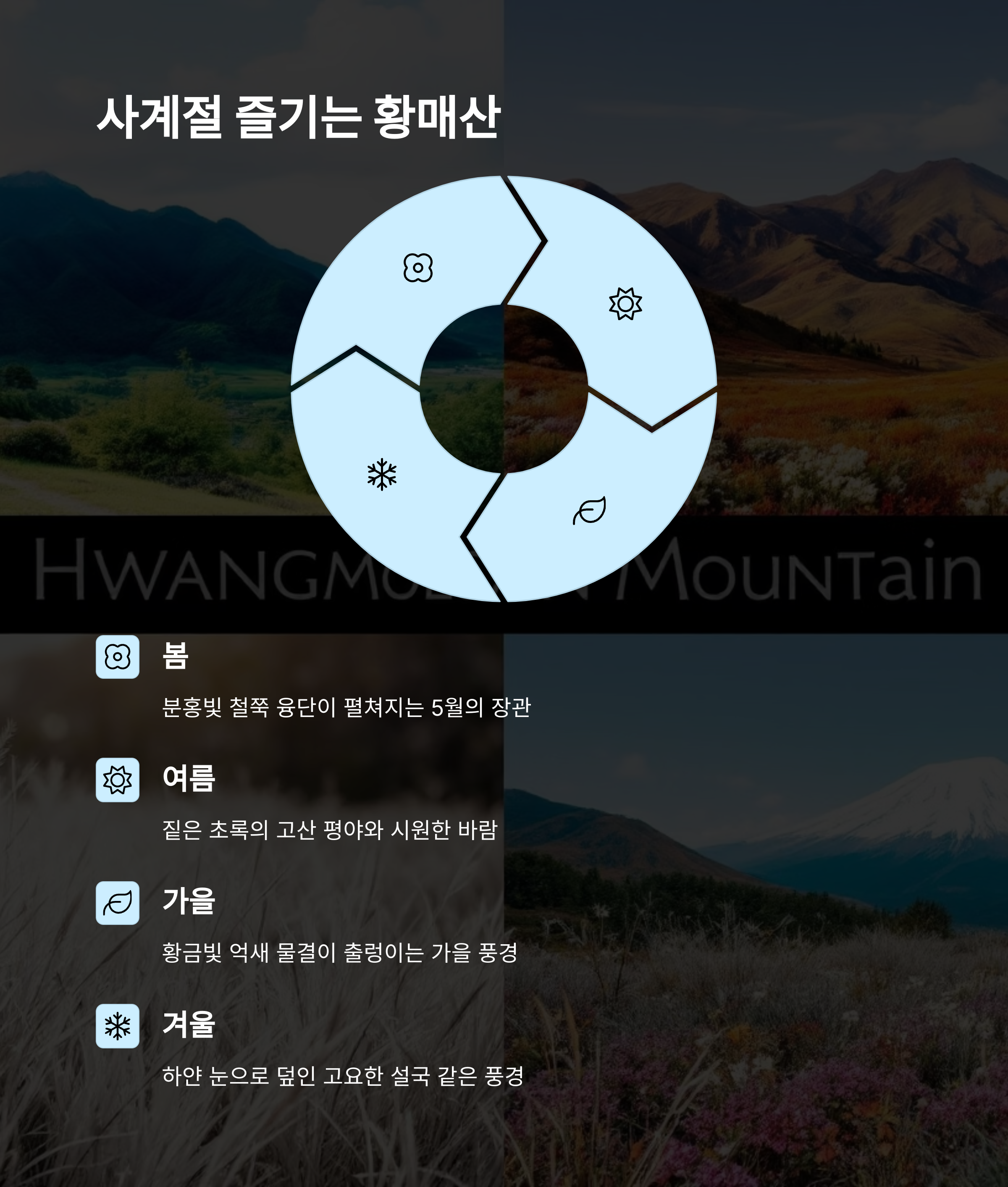 | 계절별 매력 | 봄 철쭉, 가을 억새, 겨울 설경 |