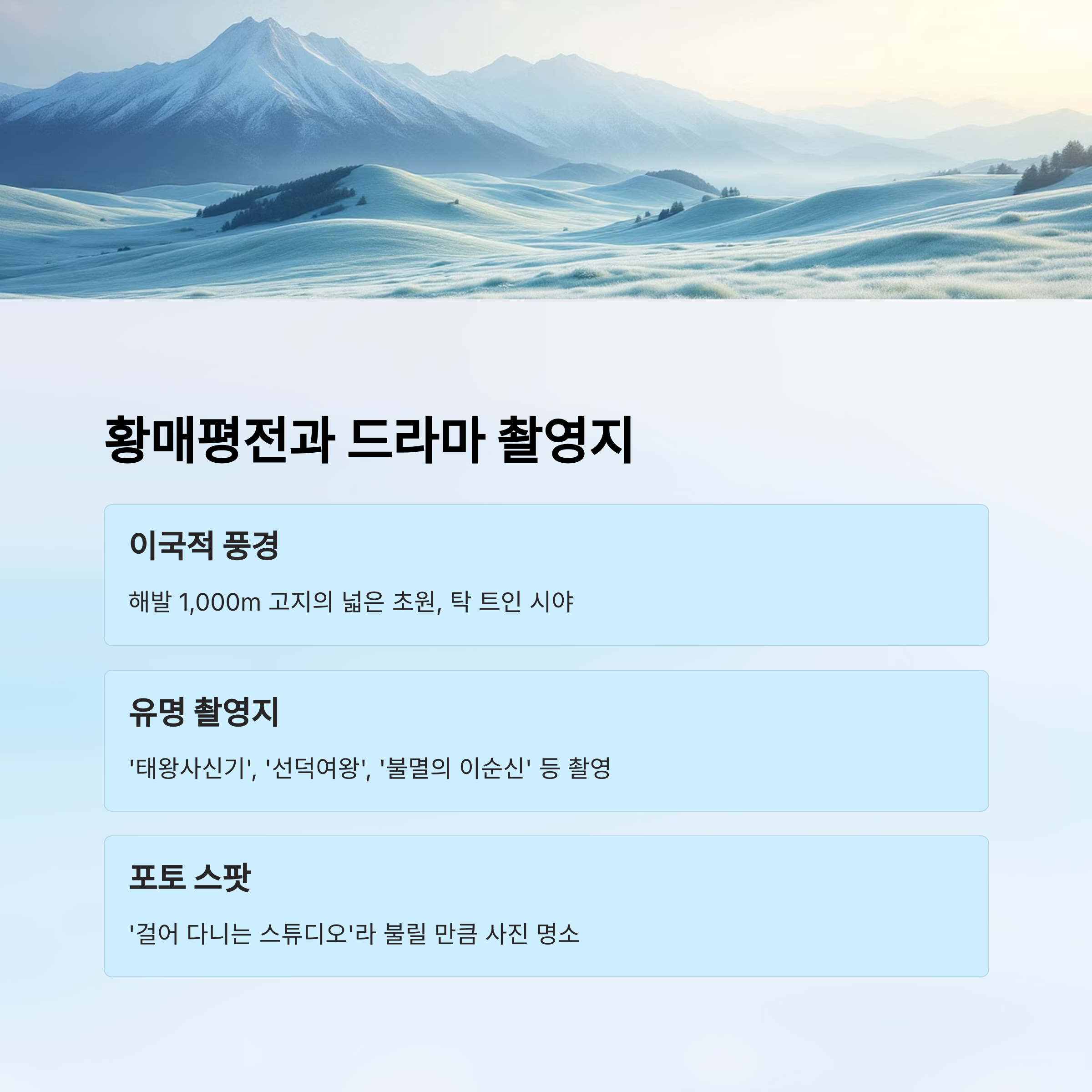 이 독특한 풍경 덕분에 황매평전은 수많은 드라마, 영화, 사극의 배경지로 활용되었어요. 실제로 <태왕사신기>, <선덕여왕>, <불멸의 이순신> 같은 유명 사극이 이곳에서 촬영되었는데요, 웅장한 자연과 어우러진 고즈넉한 분위기가 한국 고유의 정서를 담아내기에 완벽했기 때문이에요.