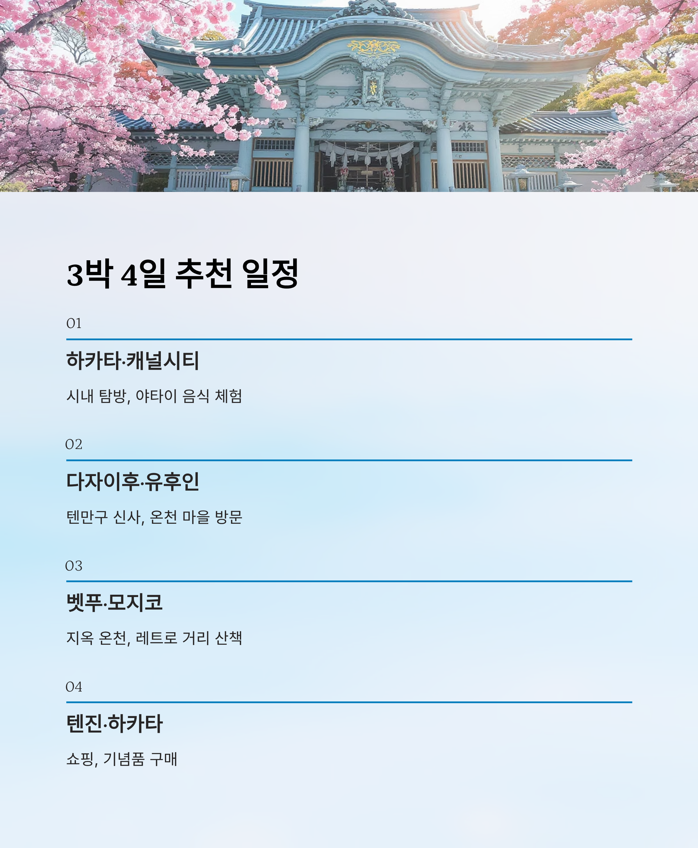 일정은 보통 하카타–텐진 중심의 시내 탐방, 근교 여행, 온천 체험으로 나누면 좋아요. 이렇게 하면 도심의 활기와 전통적인 분위기, 그리고 여유로운 힐링까지 고루 경험할 수 있죠. ✨