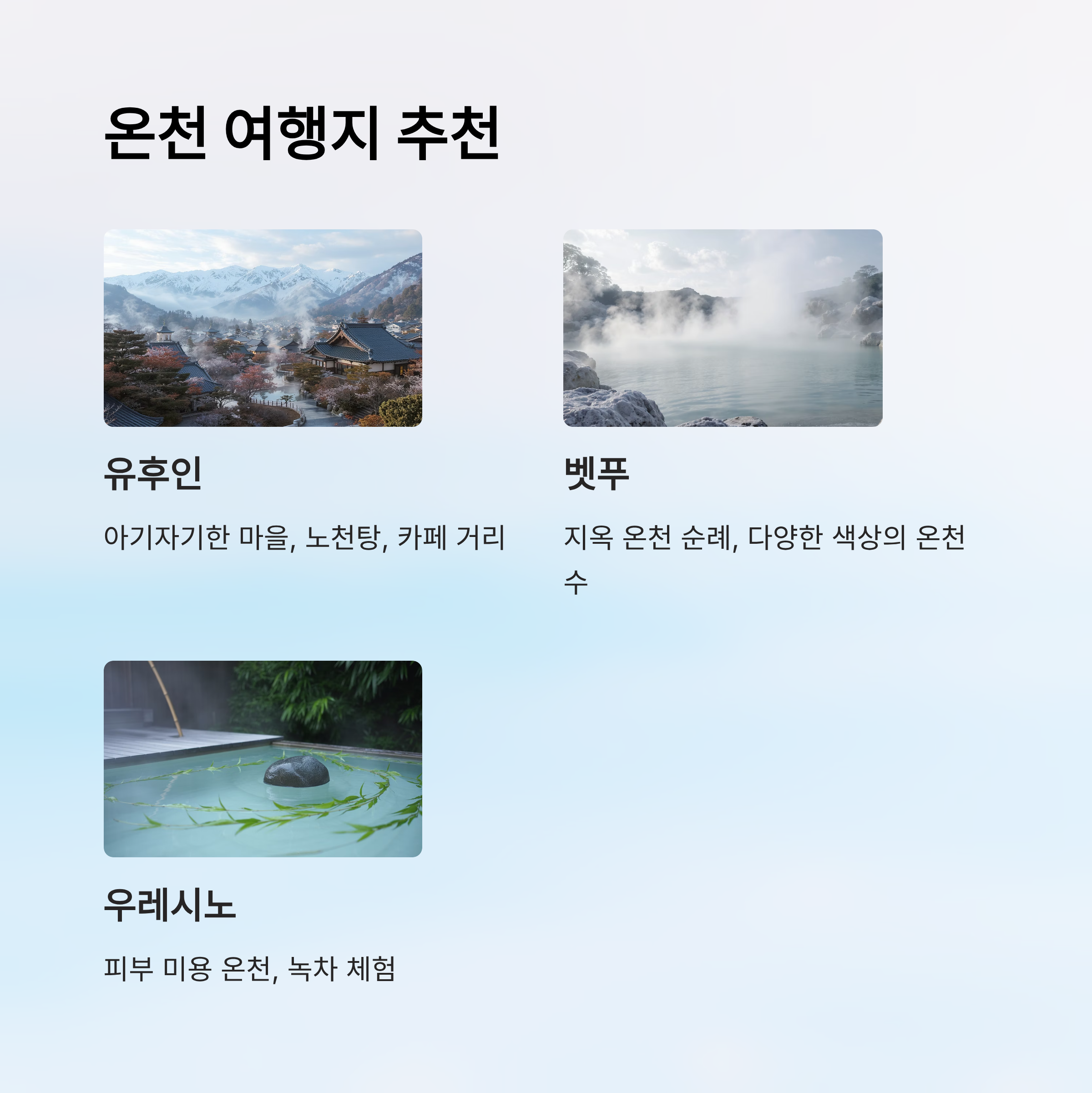 후쿠오카 여행의 또 다른 즐거움은 바로 온천이에요. 규슈 지역은 일본 내에서도 유명한 온천 명소가 밀집해 있어서, 당일치기 혹은 1박 2일로 다녀오기 딱 좋아요. 따뜻한 온천물에 몸을 담그면 피로가 풀리고 여행의 여유를 제대로 만끽할 수 있답니다. 🛀