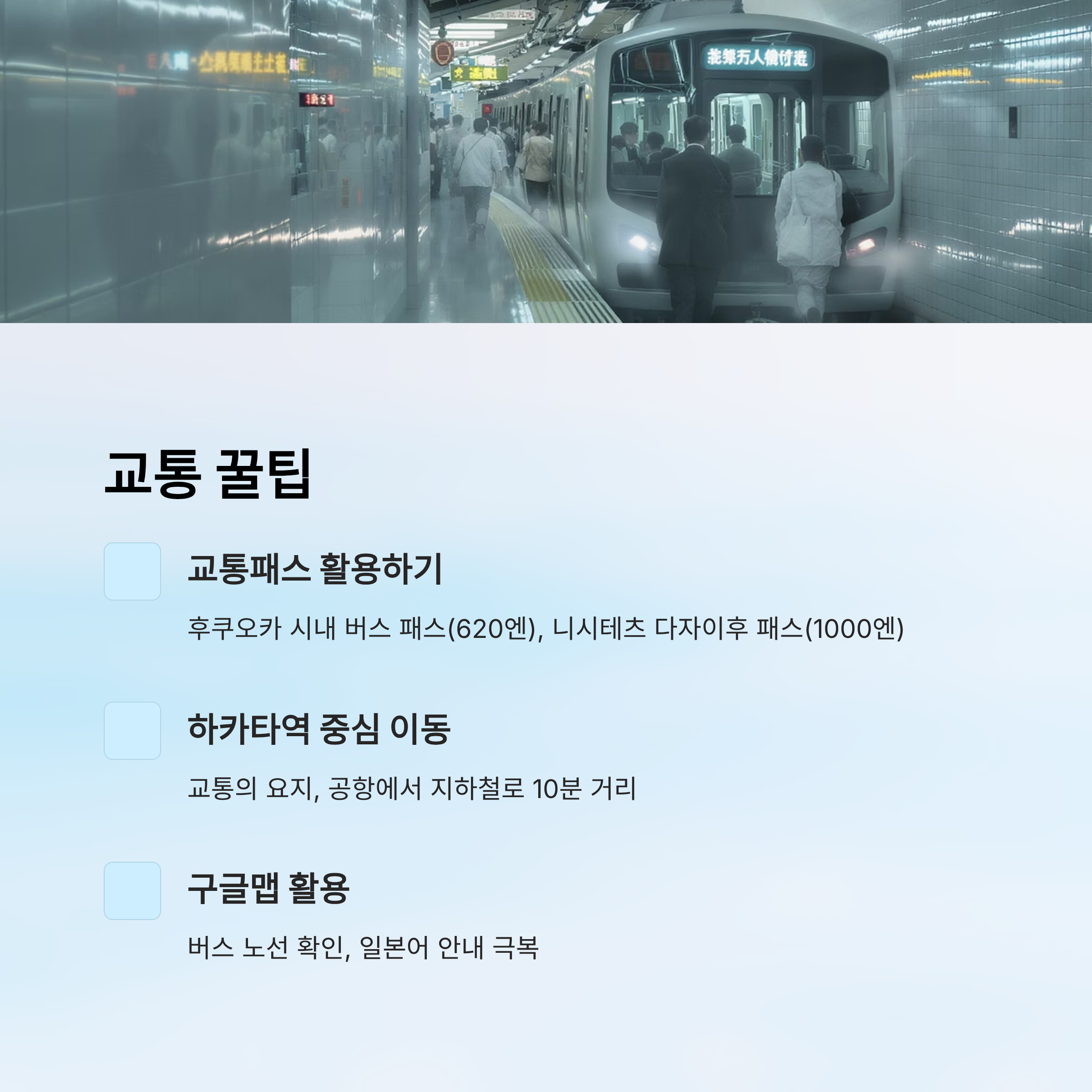후쿠오카는 규모가 크지 않아 3박 4일 동안 충분히 주요 명소와 먹거리를 즐길 수 있어요. 첫날부터 마지막 날까지 동선을 알차게 짜두면, 체력적으로 무리하지 않으면서도 다양한 매력을 느낄 수 있답니다. 특히 대중교통이 잘 되어 있어 초보 여행자도 쉽게 이동할 수 있어요. 🚋