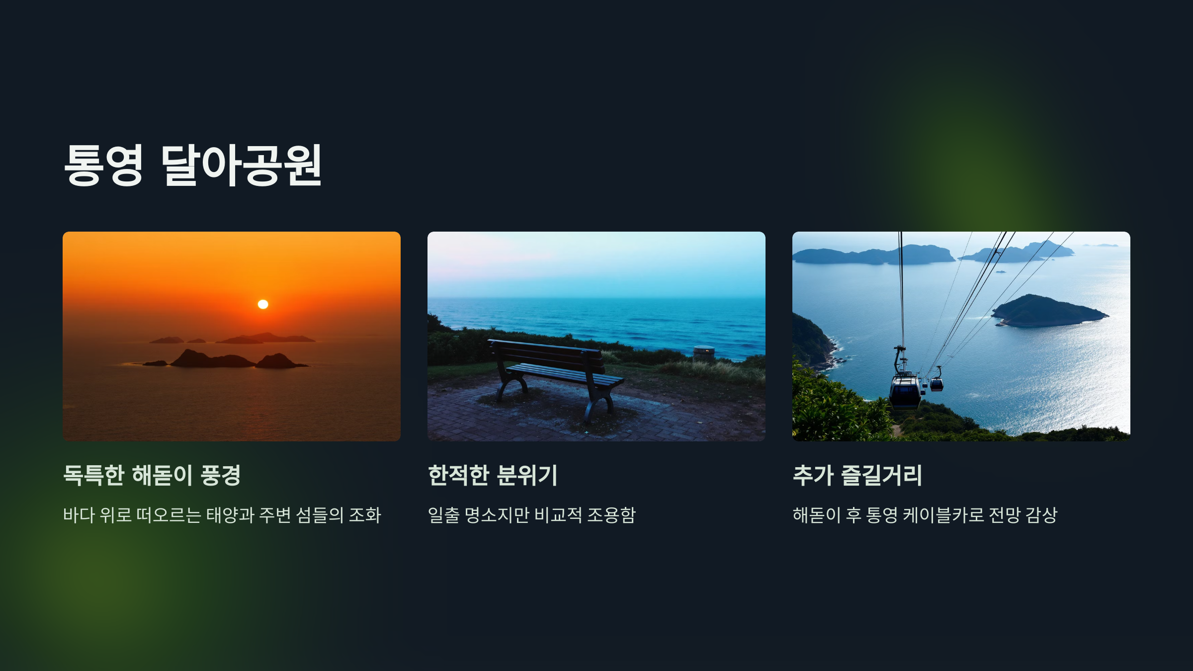 통영의 달아공원은 일출 명소로 알려져 있지만, 비교적 한적한 편이라 조용히 해돋이를 즐길 수 있습니다. 바다 위로 떠오르는 태양과 함께 주변 섬들이 만들어내는 풍경은 마음을 정화시켜 줍니다.