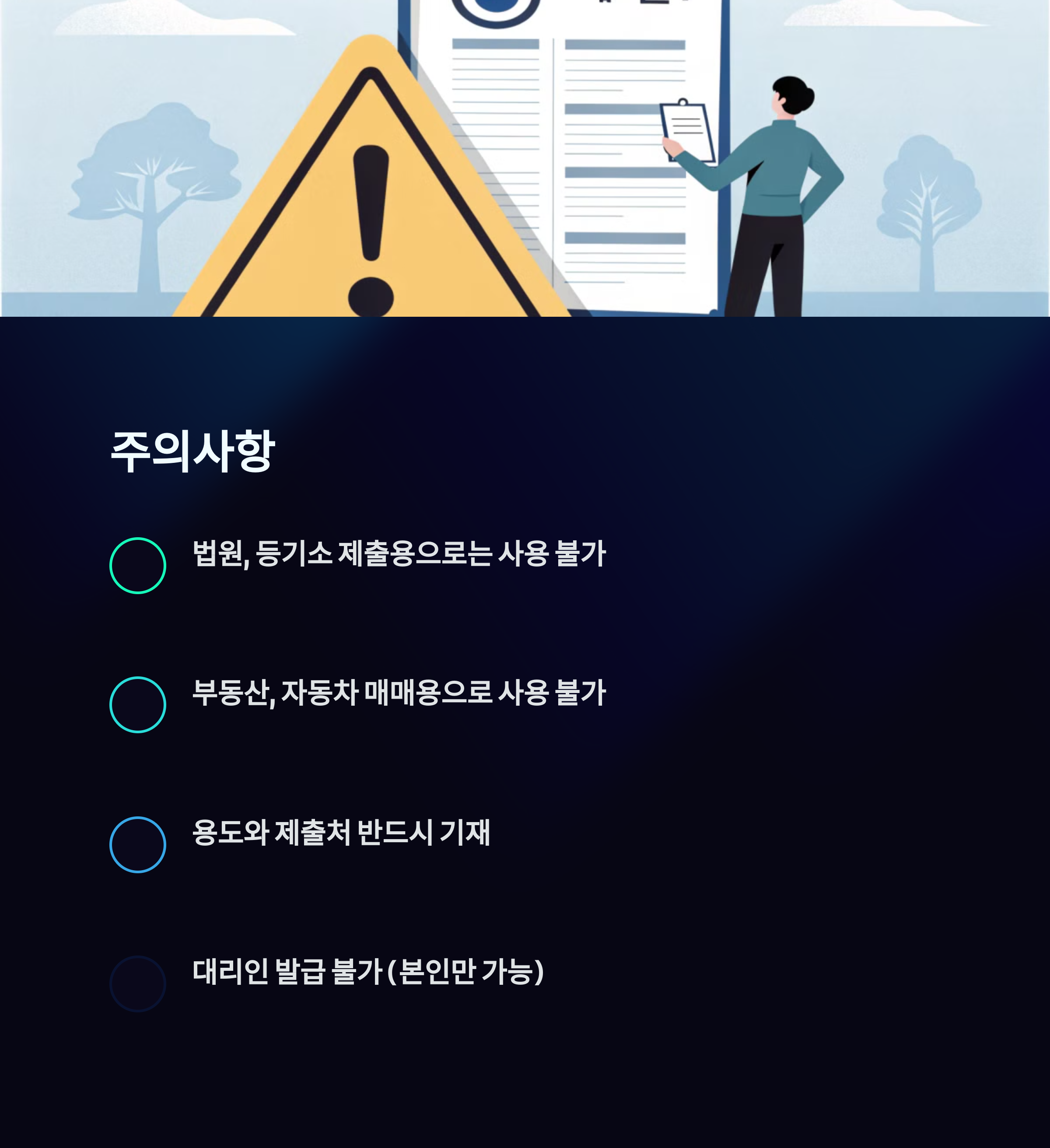 위 표에서 보듯이 온라인 발급은 편리하지만, 모든 용도로 사용할 수 있는 것은 아니에요. 반드시 제출처의 요구 사항을 확인하고 적절한 방법으로 발급받아야 해요.