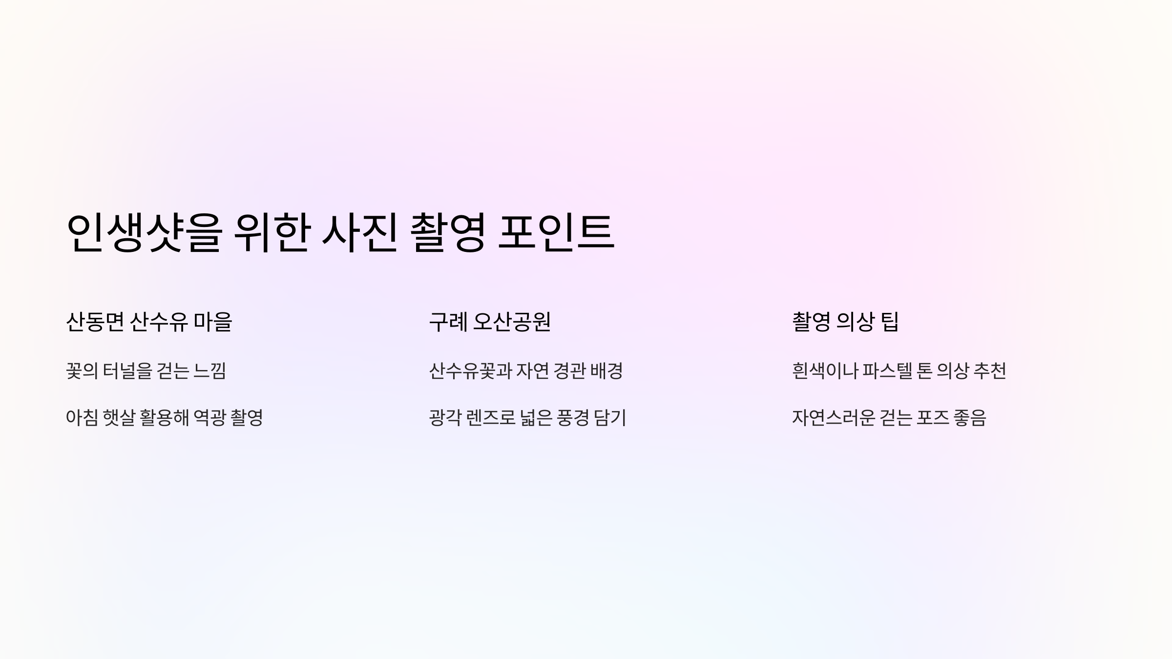| 촬영 포인트 | 추천 포즈 | 촬영 팁 |