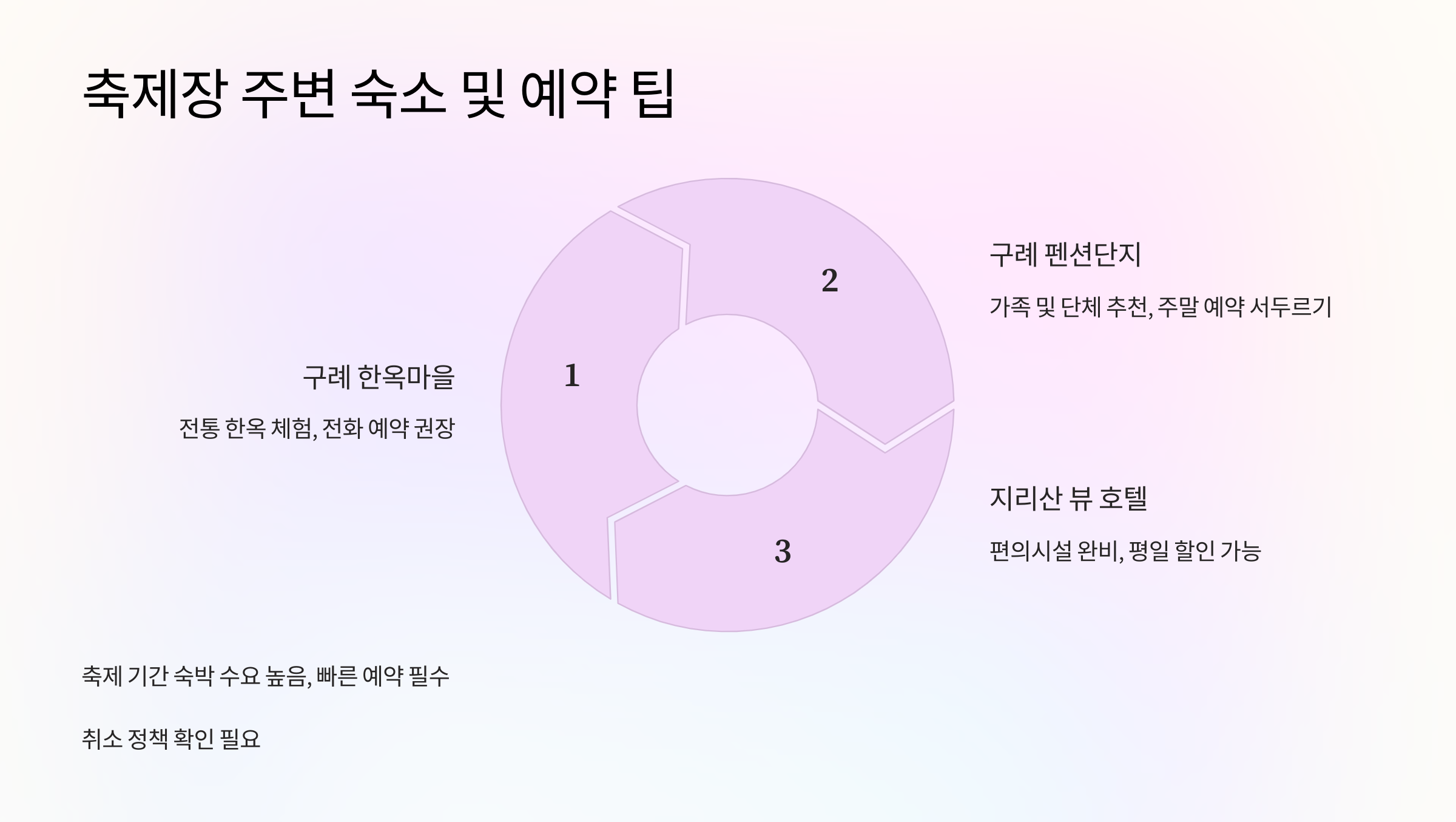 추천 숙소 유형으로는 한옥스테이, 펜션, 호텔이 있어요. 한옥스테이는 한국적인 분위기를 느낄 수 있고, 펜션은 단체 여행객에게 좋아요. 호텔은 편의 시설이 잘 갖춰져 있어 편리해요. 특히 예약은 가능한 빨리 하는 게 좋아요. 축제 기간에는 숙박 수요가 높아져요.