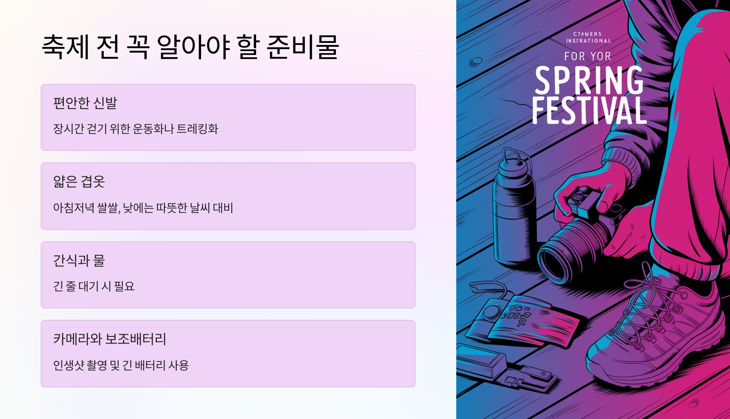 둘째, 날씨에 따라 변동이 심하니 얇은 옷을 여러 겹 겹쳐 입는 게 좋아요. 아침과 저녁은 쌀쌀할 수 있지만, 낮에는 따뜻해서 옷을 벗을 수 있어요. 셋째, 간단한 간식과 물을 챙겨가는 것도 추천해요. 물론 축제 현장에서 먹거리를 구입할 수 있지만, 줄이 길 때 대비해요.