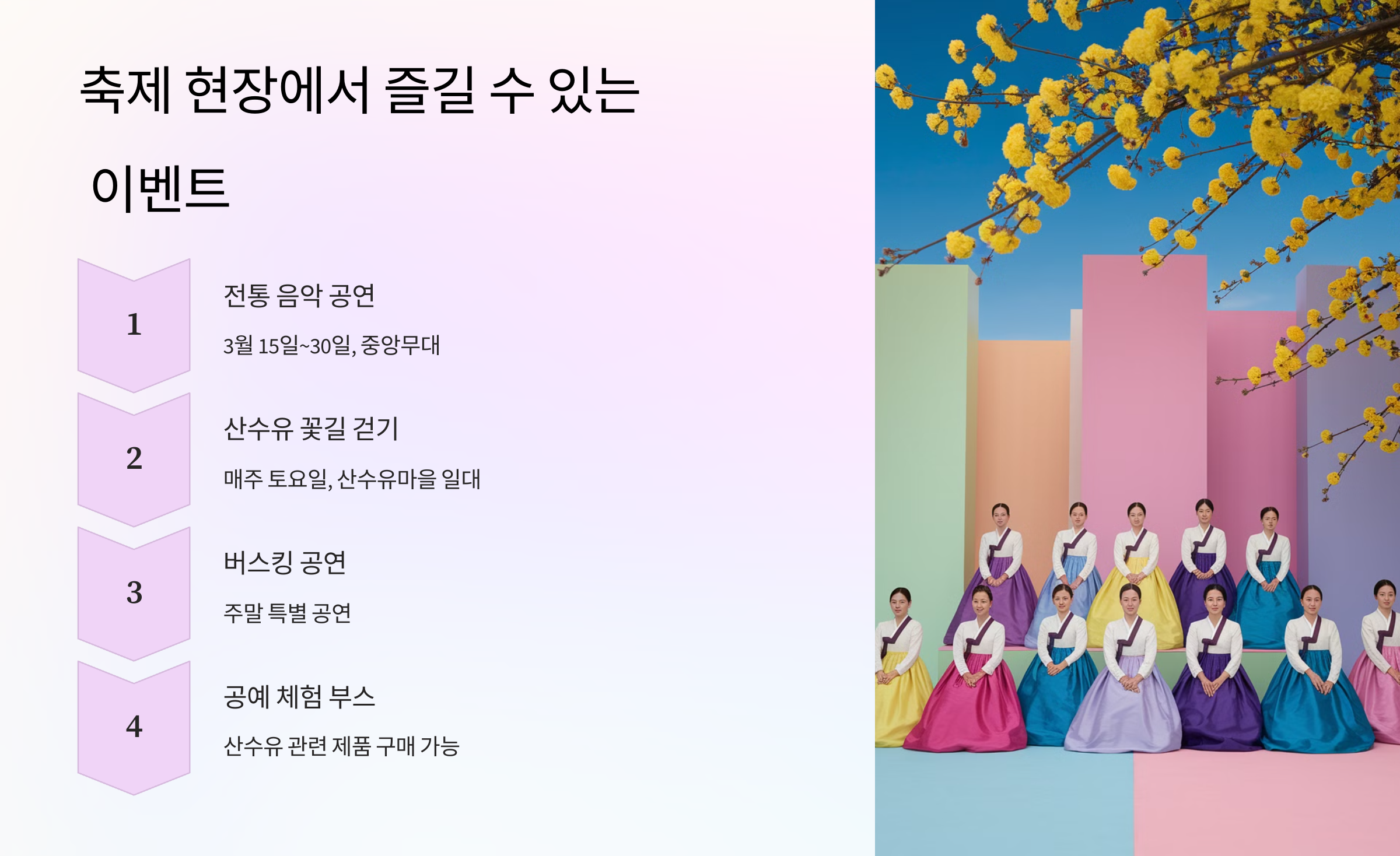대표적인 프로그램으로는 '산수유 꽃길 걷기' 행사가 있어요. 꽃으로 가득한 길을 걸으며 자연을 만끽할 수 있어요. 또한, '전통 공연'에서는 남도 특유의 흥과 멋을 느낄 수 있답니다. 특별히 주말에는 버스킹 공연도 많이 열리니 놓치지 마세요!