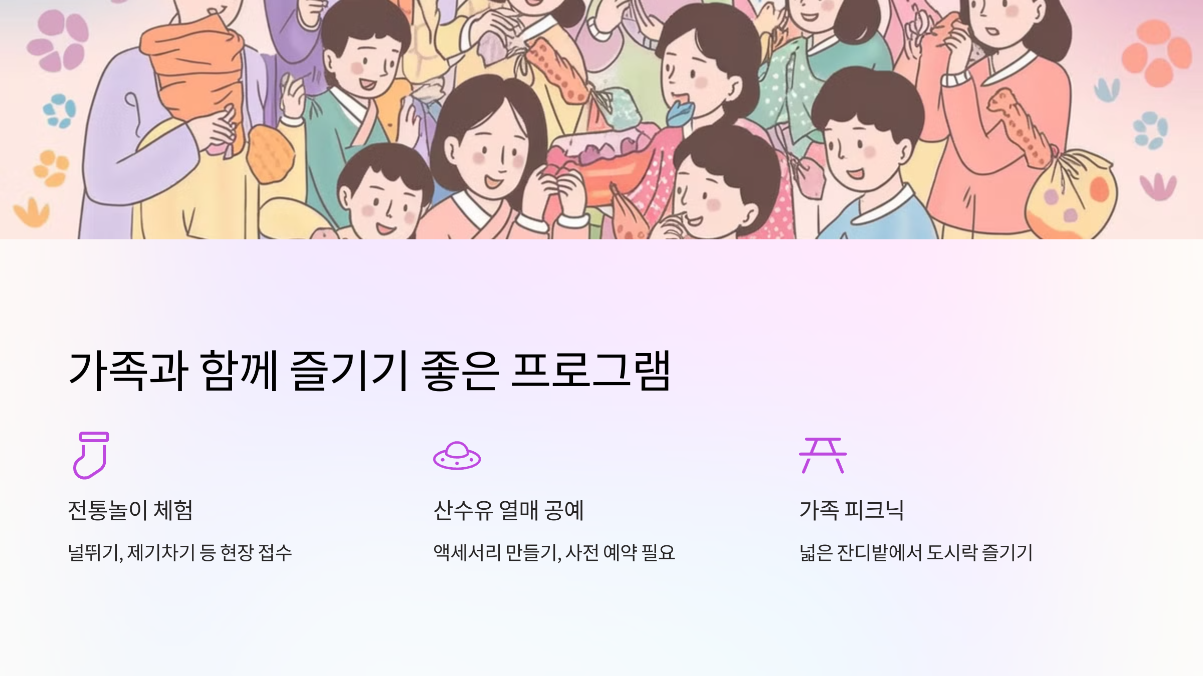 | 전통놀이 체험 | 모든 연령 | 현장 접수 |