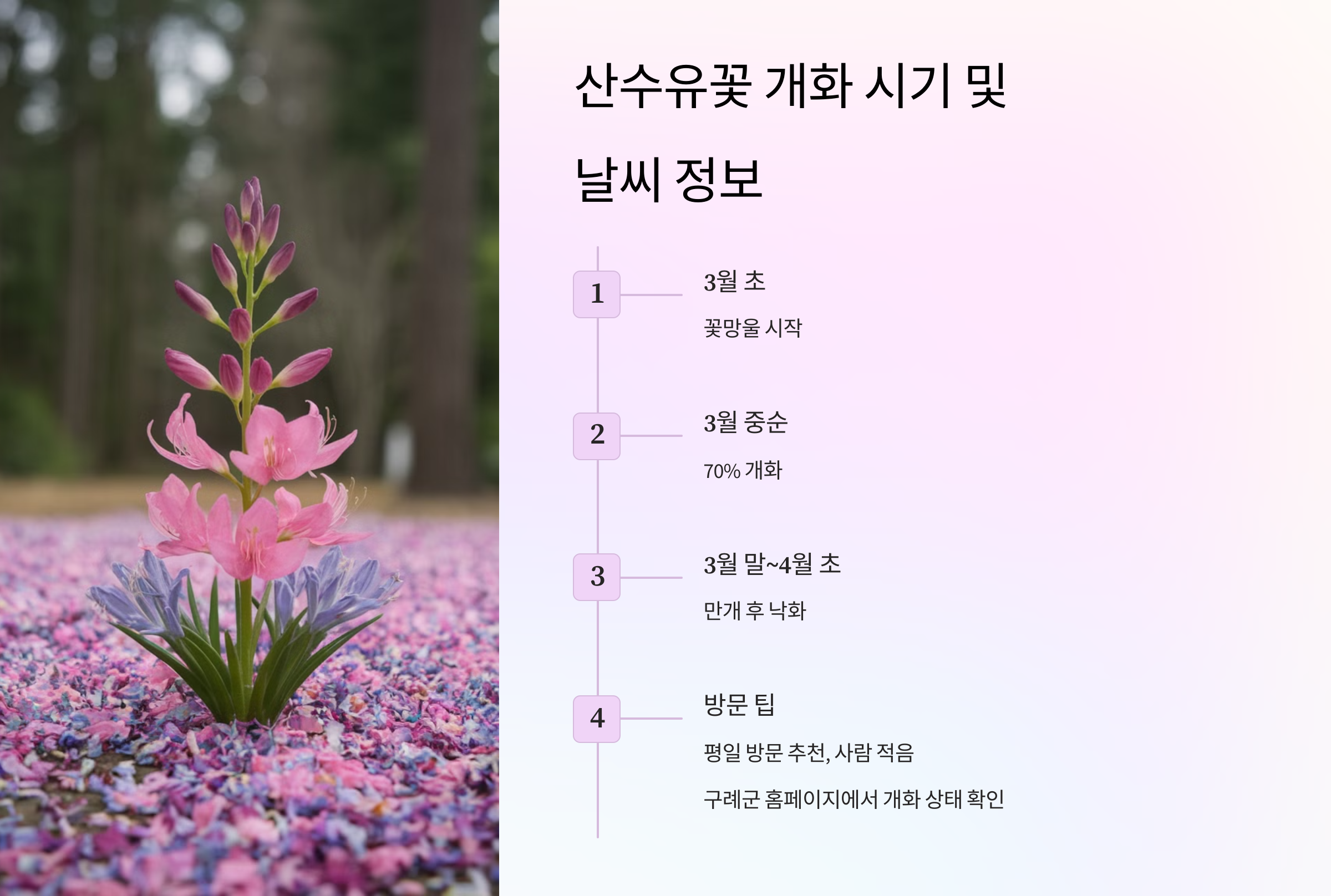 올해 2025년에는 날씨가 평년보다 따뜻해 3월 초부터 꽃망울이 피기 시작했어요. 실시간 개화 상황은 구례군 공식 홈페이지나 SNS에서 확인할 수 있답니다. 또한, 주말보다 평일 방문을 추천해요. 사람이 적어 한적하게 꽃을 즐길 수 있거든요.