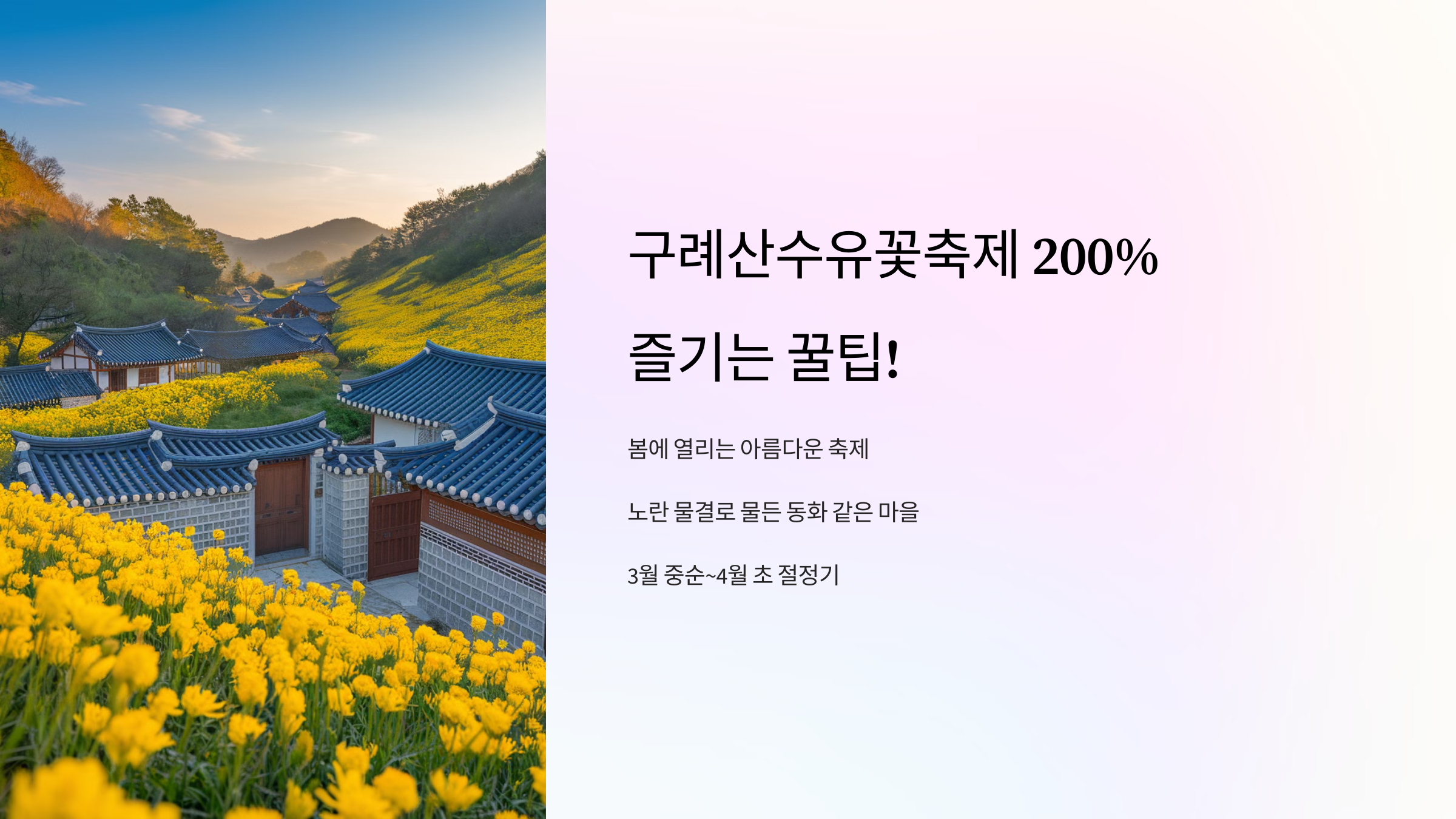 구례산수유꽃축제는 매년 봄, 산수유꽃이 만개하는 시기에 열리는 아름다운 봄 축제예요. 특히 구례의 산수유마을은 온통 노란 물결로 물들어 마치 동화 속에 들어온 듯한 기분을 느낄 수 있답니다. 이 축제를 200% 즐기기 위해 알아야 할 꿀팁들을 지금부터 소개할게요! 🌼