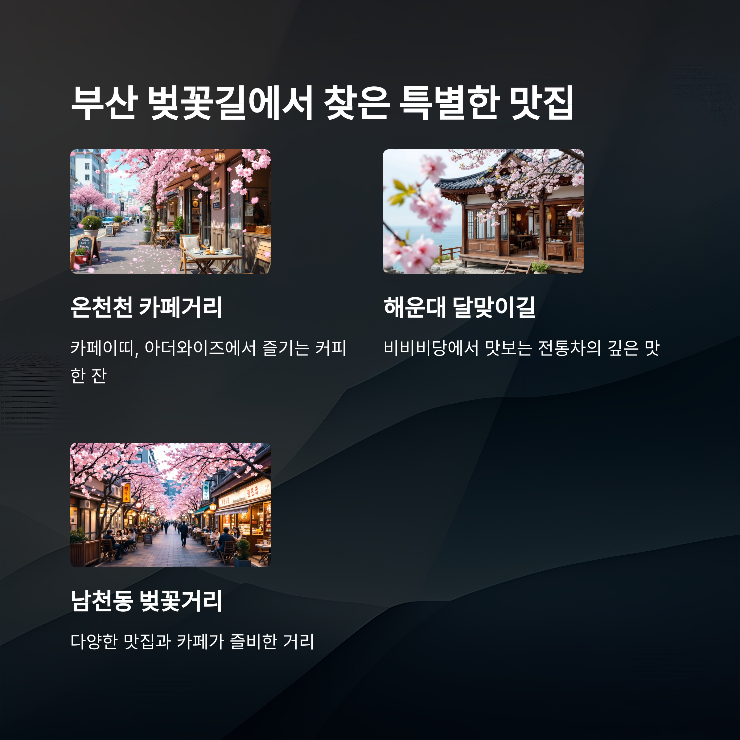 부산은 도시 자체가 바다와 꽃, 그리고 길이 잘 어우러진 구조라서 산책하다가 바로 카페나 맛집으로 들어가기 너무 좋아요. 온천천, 삼락생태공원, 달맞이길 등 벚꽃 명소 근처에는 감성 넘치는 로컬 맛집들이 줄지어 있어요. 특히 해변 벚꽃길은 부산만의 매력을 톡톡히 보여주죠 🌸🌊