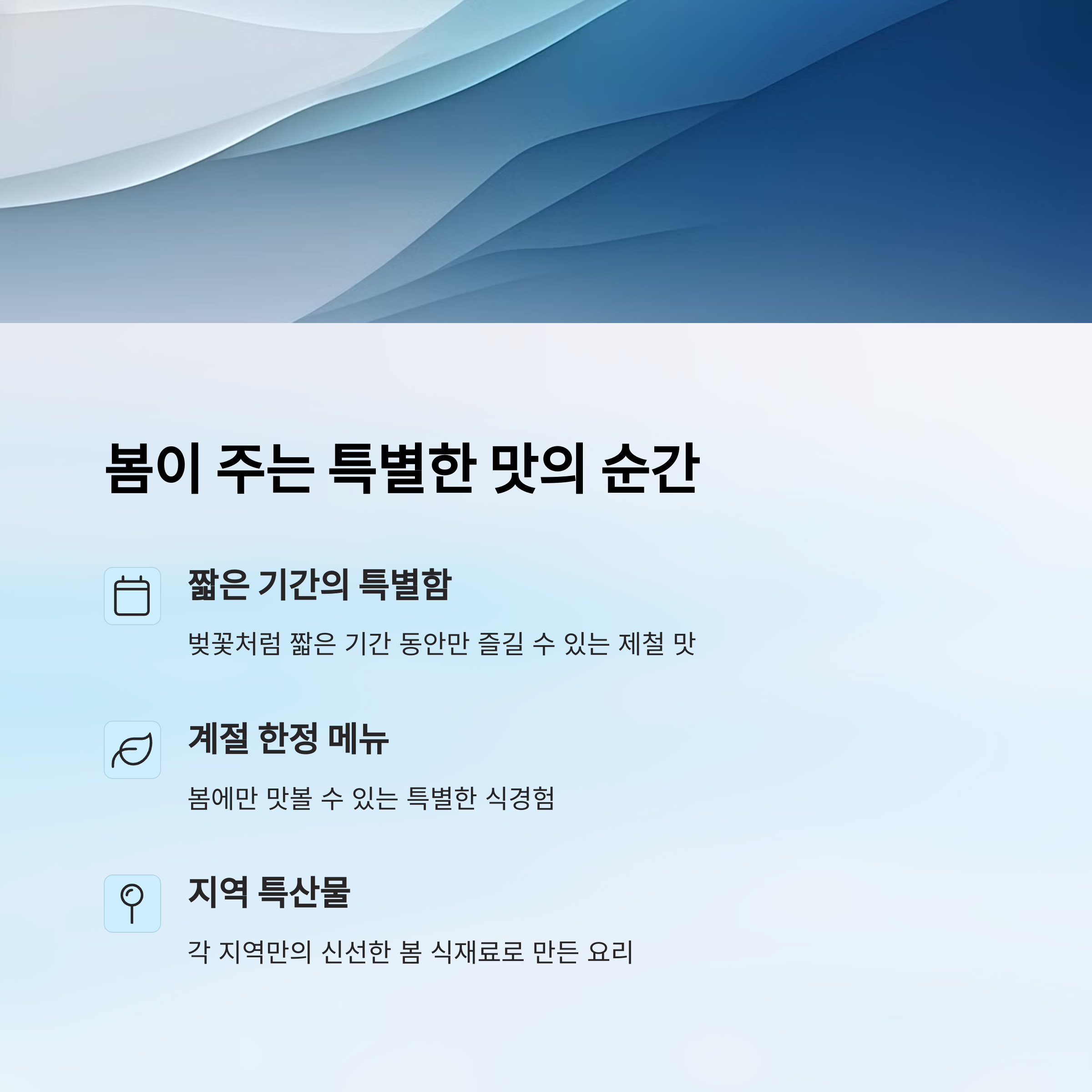 | 제철 식재료 | 쑥, 냉이, 주꾸미, 도다리, 딸기 등 | 향긋함, 계절의 신선함 |