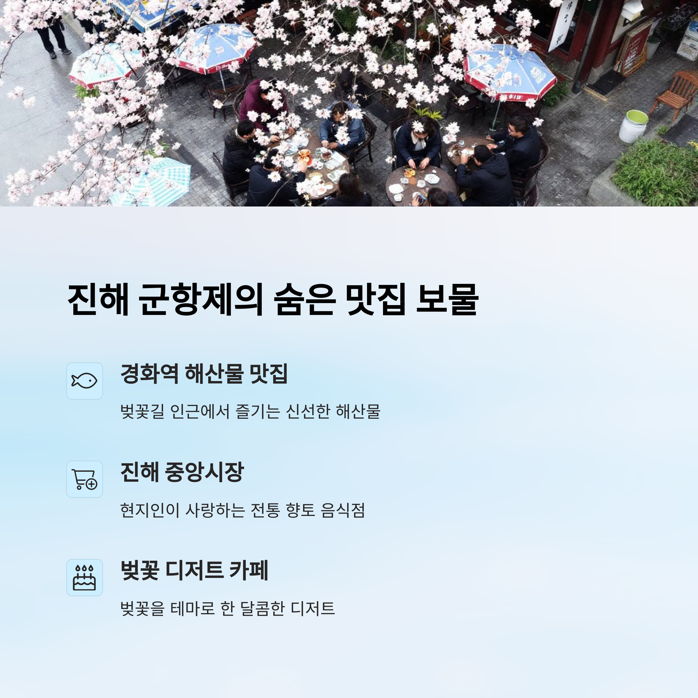 진해는 전국에서 가장 유명한 벚꽃 축제 ‘군항제’가 열리는 곳이에요. 여좌천, 경화역, 중원로터리 등 벚꽃 명소들이 한 자리에 모여 있어 하루 종일 꽃 구경만 해도 모자랄 정도죠. 그런 진해에서 걷다가 허기질 때, 딱 좋은 로컬 맛집들을 소개할게요 😋