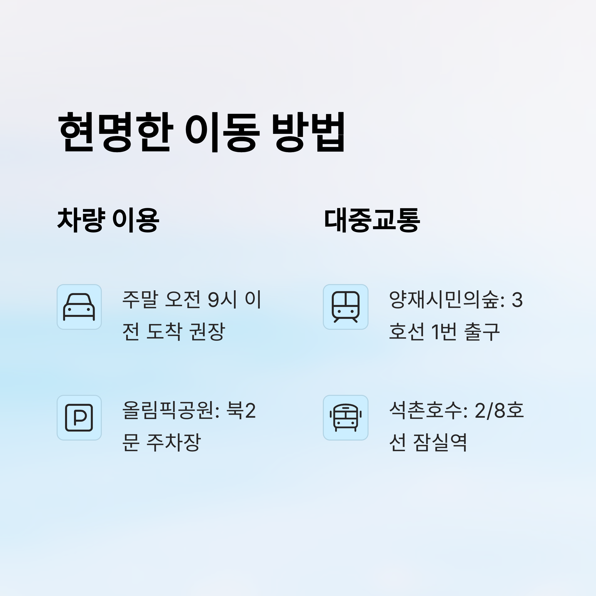 🚶 혼자 가는 경우엔 대중교통이 오히려 여유롭고, 친구나 가족 단체라면 차량이 편할 수도 있어요. 하지만 주차 전쟁 피하고 싶다면 아침 일찍 출발은 필수랍니다!