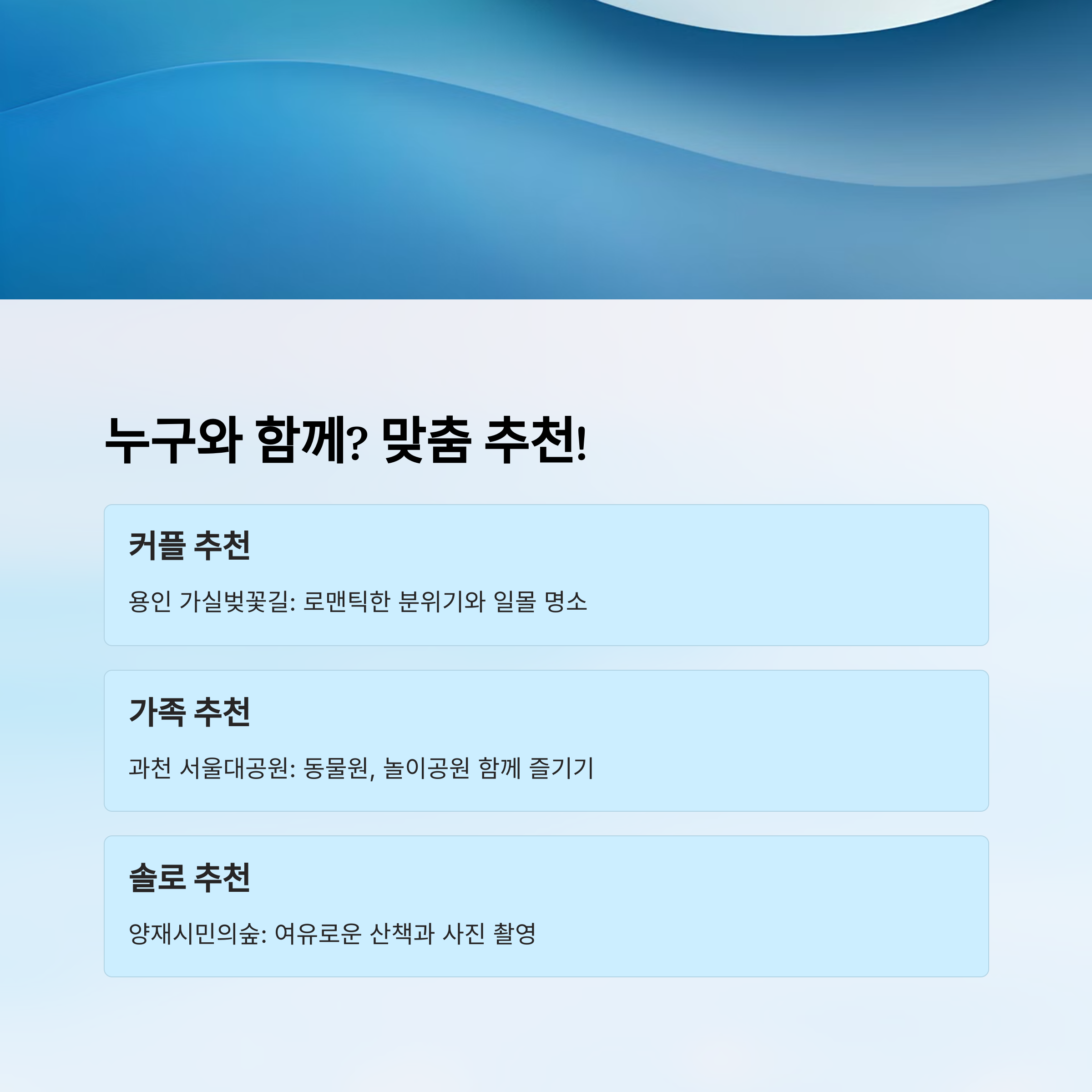 벚꽃 명소라고 해서 모두에게 다 똑같은 장소가 잘 맞는 건 아니에요. 누구랑 가느냐에 따라 분위기도 다르고, 이동 거리, 동선, 필요한 시설까지 달라져요. 그래서 함께하는 사람에 맞는 최적의 장소를 골라야 진짜 만족도 100% 나와요!