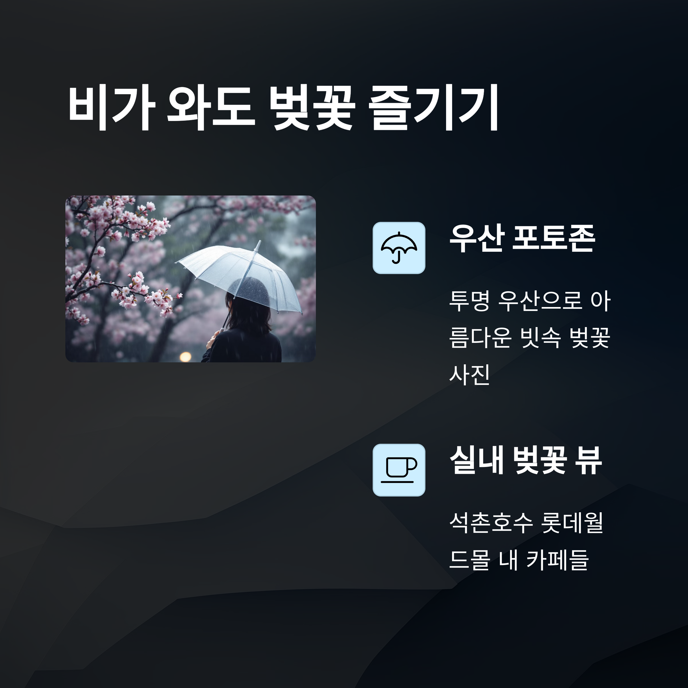 🌧️ 비가 와도, 감성은 유지할 수 있어요. 준비만 잘 되어 있으면 오히려 특별한 추억을 만들 수도 있죠. 우중충한 날씨에 쏙 들어맞는 벚꽃샷, 도전해보세요!