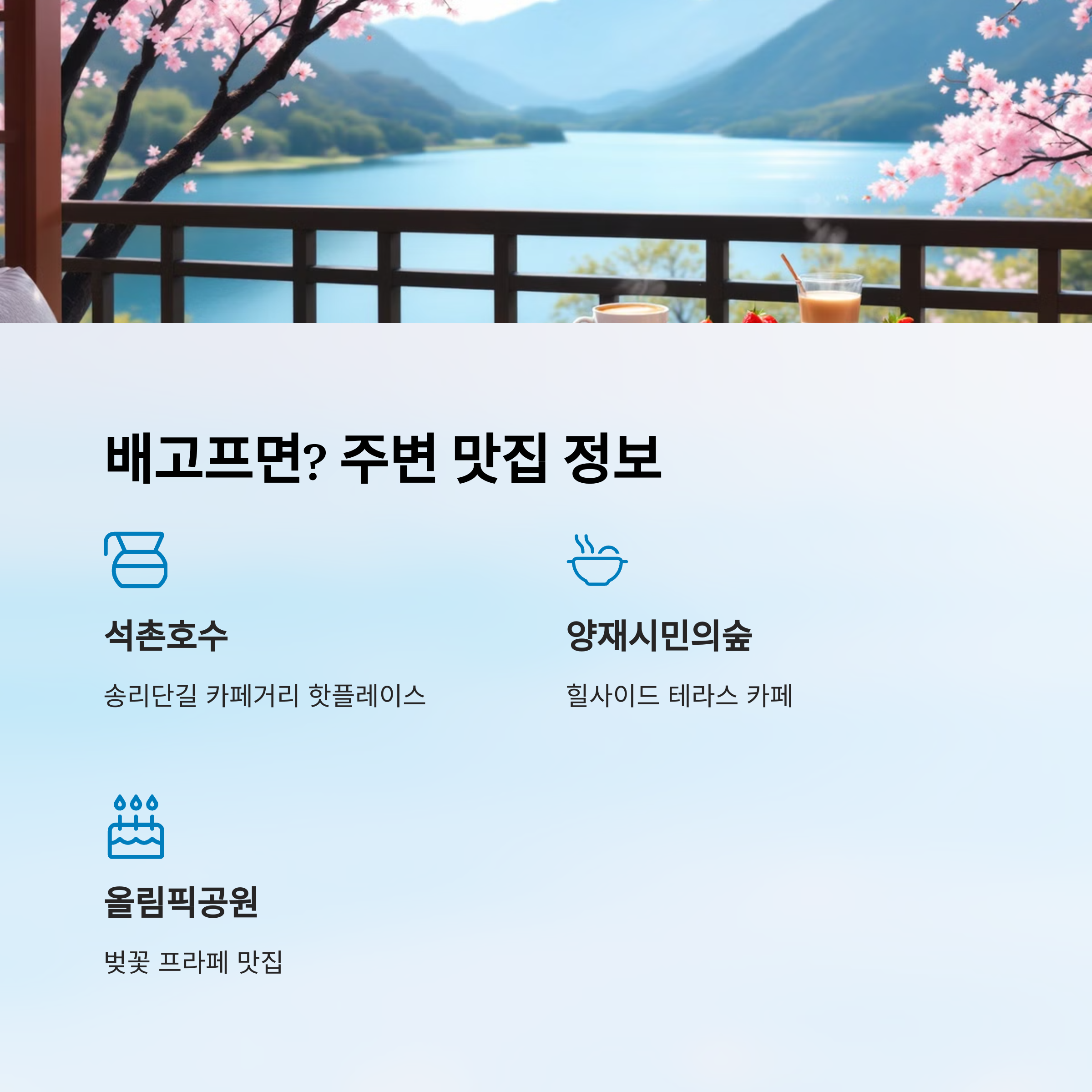 벚꽃길을 다 걷고 나면 출출하잖아요? 그냥 집에 돌아가기엔 아쉬운 그 순간! 가까운 감성 카페나 현지 맛집에서 여유롭게 쉬어가는 것도 꼭 필요해요. 위치 좋고, 분위기 좋은 곳으로만 골라봤어요 😊