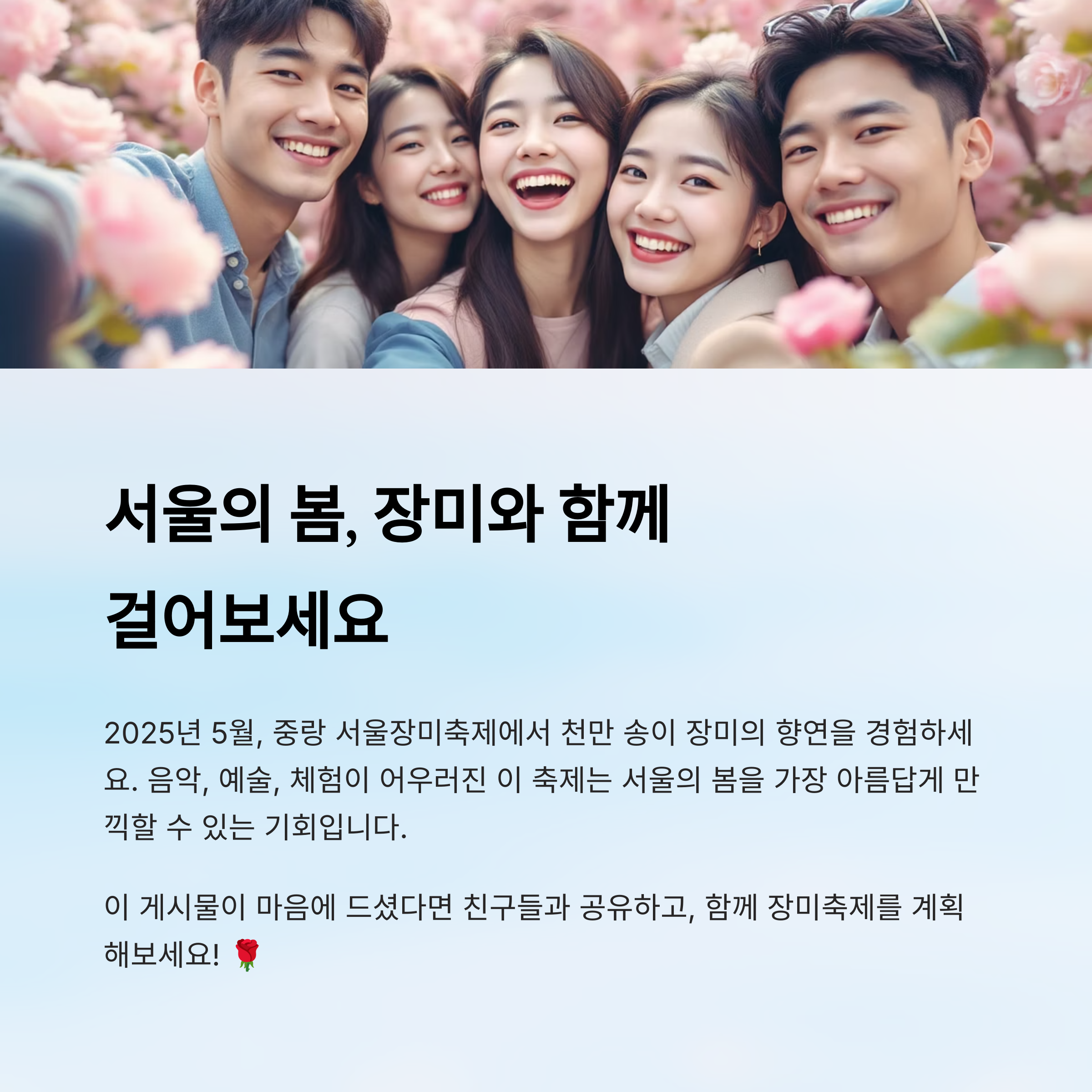 🌹 중랑 서울장미축제는 도심 속에서 만나는 가장 향기롭고 다채로운 봄날의 선물이자, 모두가 함께 만드는 따뜻한 문화축제예요. 꼭 방문해 보세요!