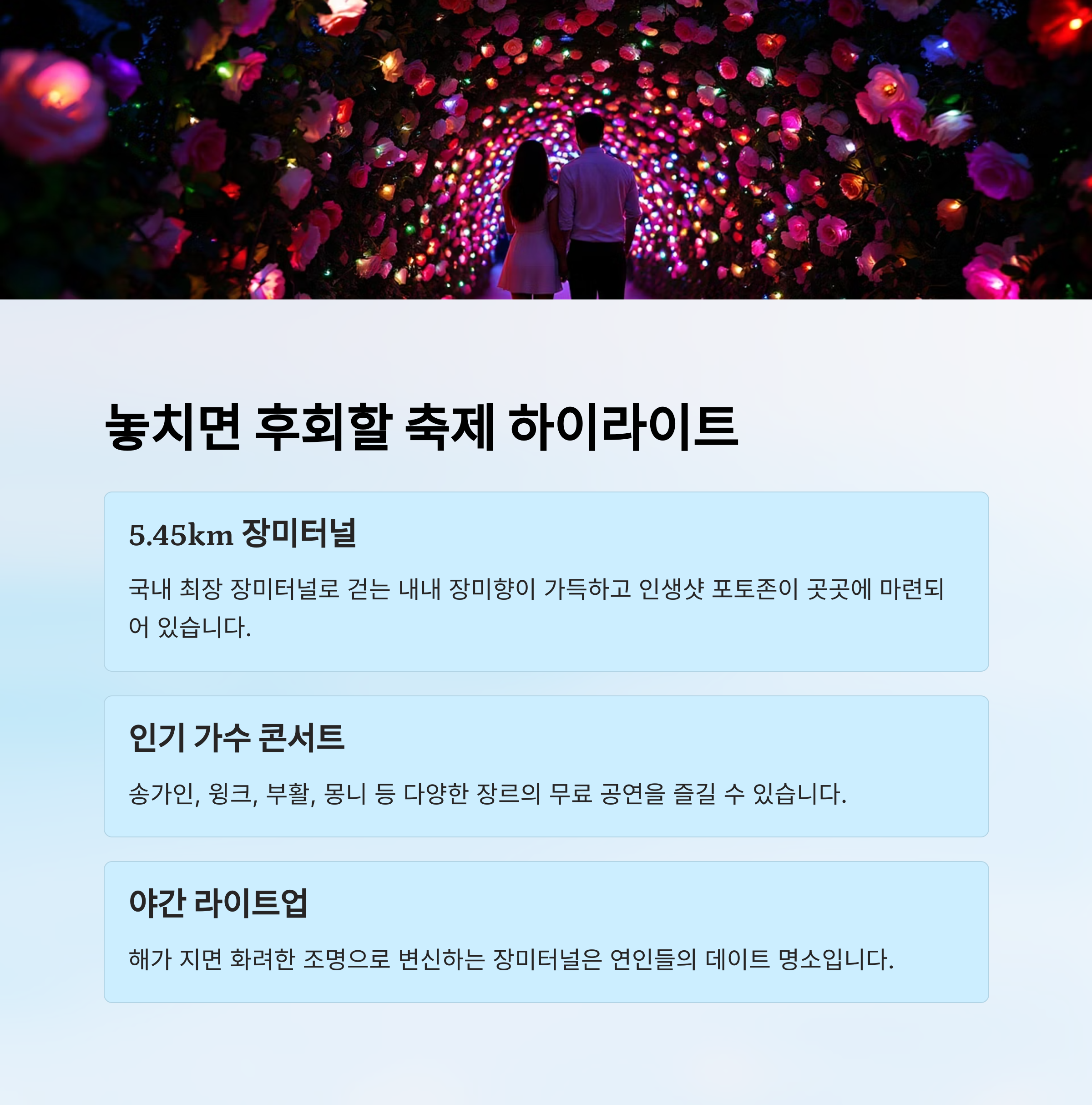| 장미터널 | 5.45km 국내 최장, 수많은 포토존 |