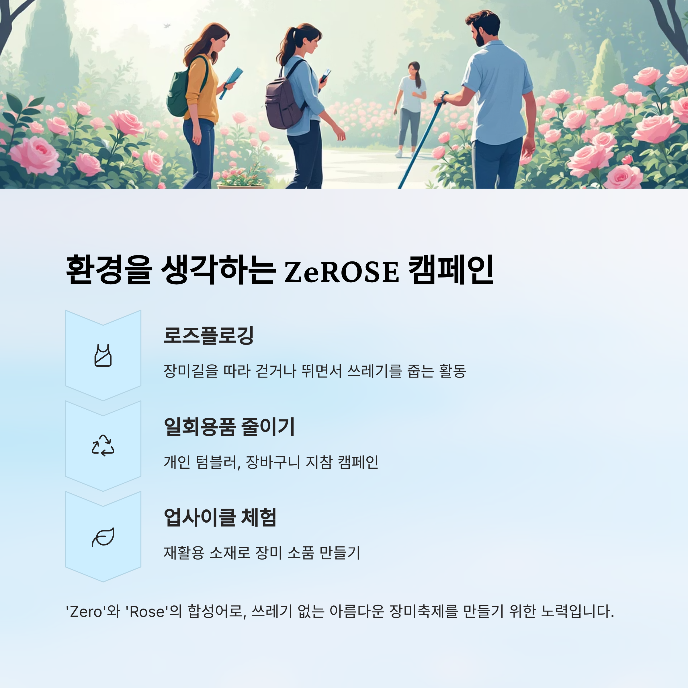 ZeROSE 캠페인은 단순히 쓰레기를 줄이는 것을 넘어서, 축제를 통해 우리가 자연과 어떻게 공존해야 하는지를 다시 생각하게 해주는 중요한 메시지를 전하고 있어요. 누구나 환경 실천의 주인공이 될 수 있답니다!