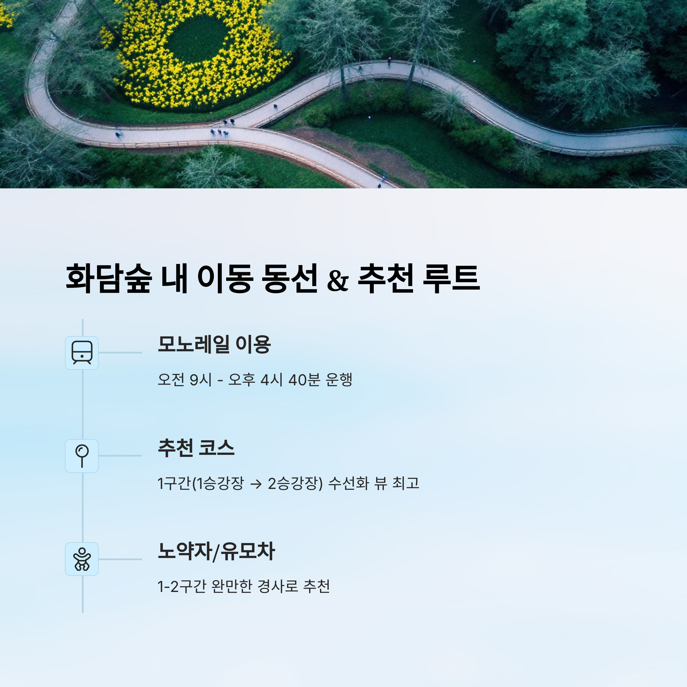 | 기본 루트 | 약 2시간 | 전체 관람객 | 입구 → 언덕길 → 하늘정원 → 온실 |