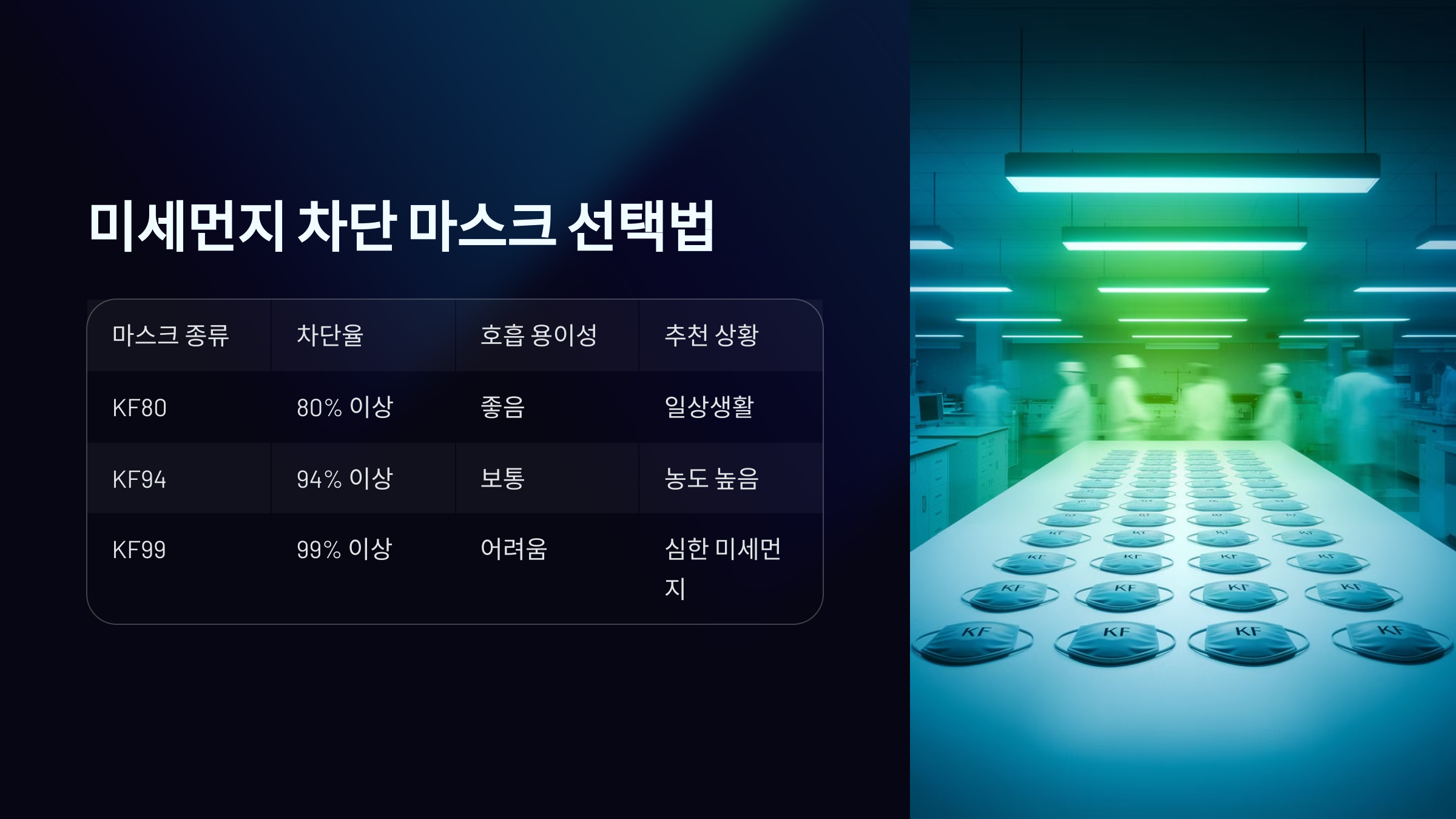 | 마스크 종류 | 미세먼지 차단율 | 호흡 용이성 | 추천 사용 상황 |