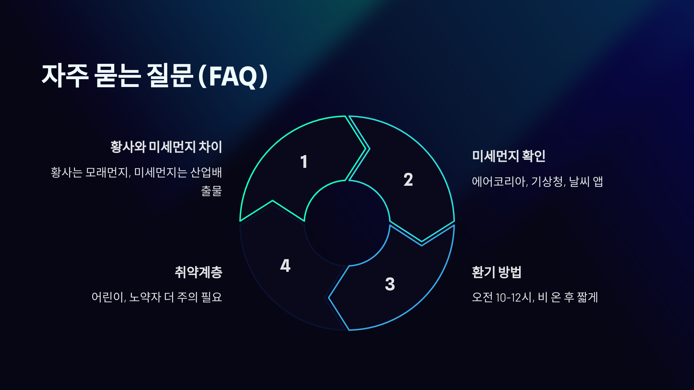 A1. 황사는 중국과 몽골의 사막에서 발생하는 모래먼지로, 입자가 크고 눈에 보일 정도예요. 반면, 미세먼지는 산업 배출, 자동차 배기가스 등에서 발생하며, 입자가 매우 작아 건강에 더 위험할 수 있어요.