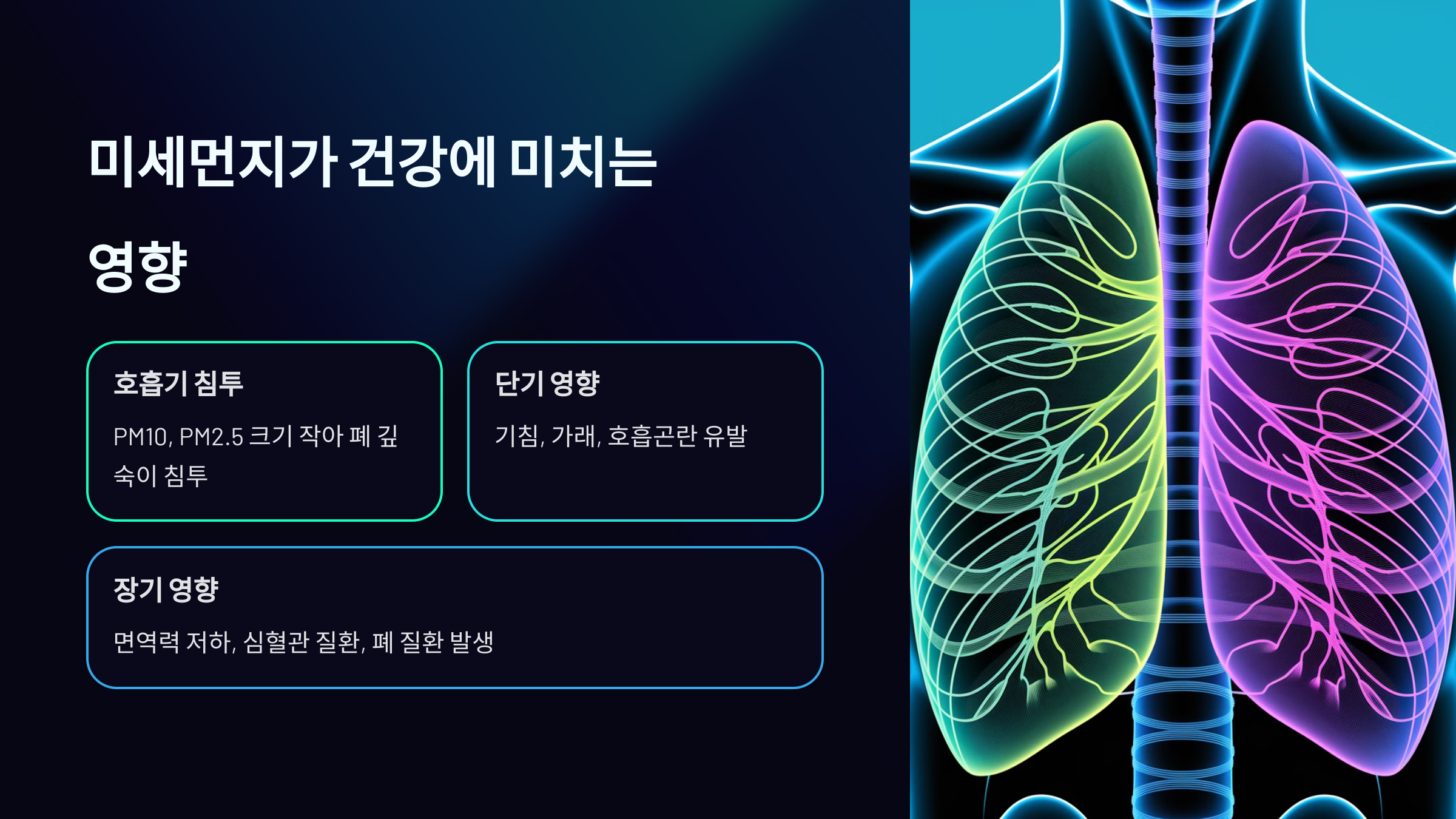 장기간 미세먼지에 노출되면 면역력이 저하되고, 심혈관 질환, 폐 질환, 심지어 뇌졸중과 같은 심각한 건강 문제가 발생할 수도 있어요.