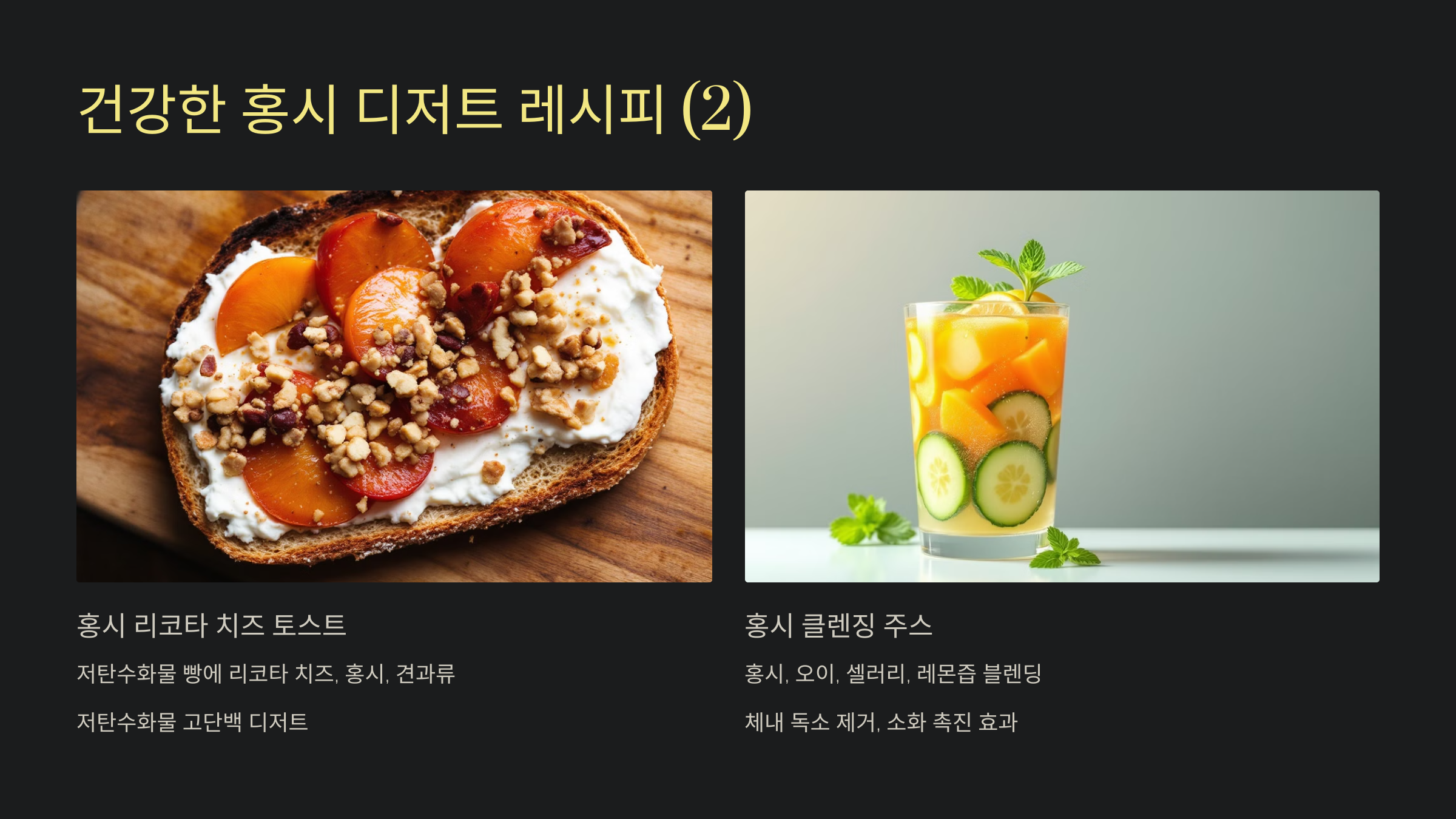 - 홍시 디저트는 소량으로도 단맛을 충분히 느낄 수 있으니, 과식하지 않도록 주의하세요.