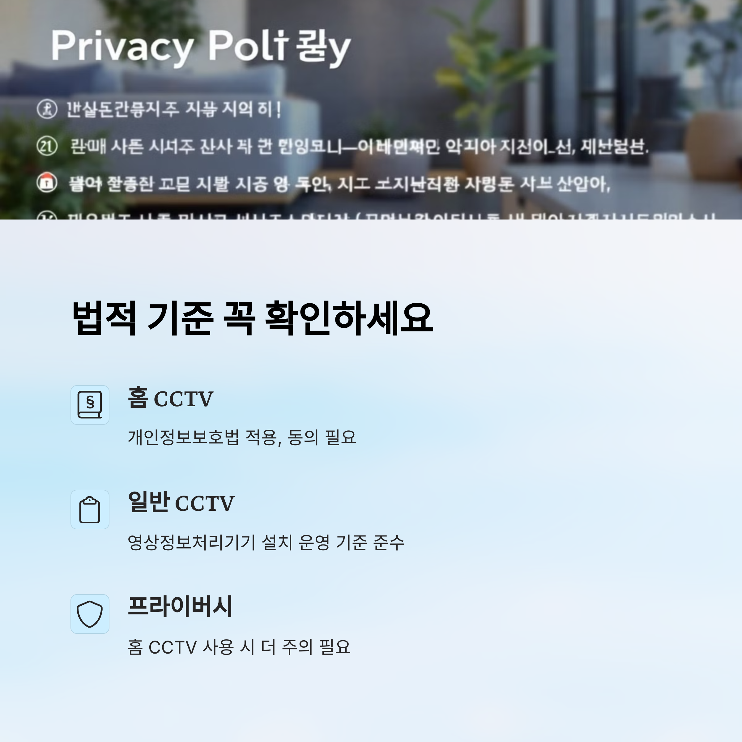 CCTV는 사람들의 일상과 얼굴, 행동을 녹화하는 장치인 만큼 관련된 법적 규제가 명확하게 존재해요. 홈 CCTV는 설치 시 사생활 침해 여부가 가장 중요한 고려 요소예요. 특히 공용 공간을 촬영하거나, 타인의 동의 없이 녹화하는 건 문제가 될 수 있어요.