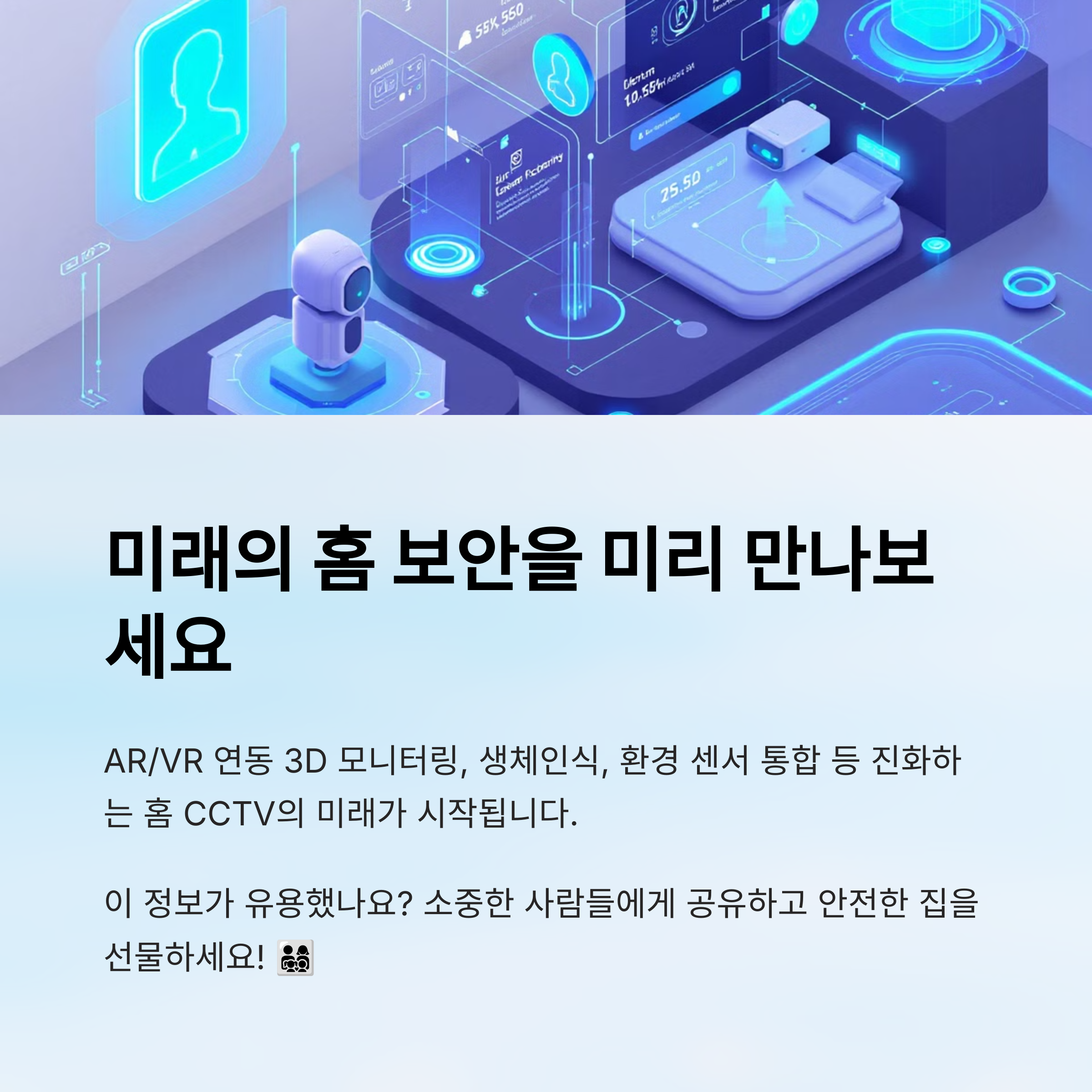 앞으로는 홈 CCTV가 단순히 범죄 예방을 넘어서, ‘지능형 생활보조 시스템’으로 진화할 가능성이 커요. 고령화 시대, 1인 가구 증가와 맞물려 더 정교하고 따뜻한 기술들이 등장할 거라고 기대돼요. 😊