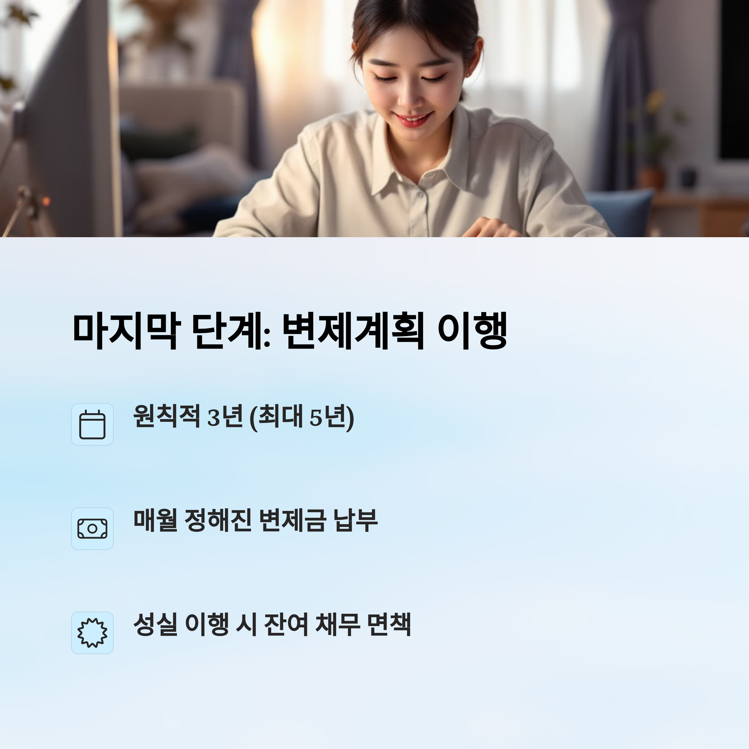 | 변제 이행 | 36개월(기본) | 매달 납입, 성실이행 필요 |