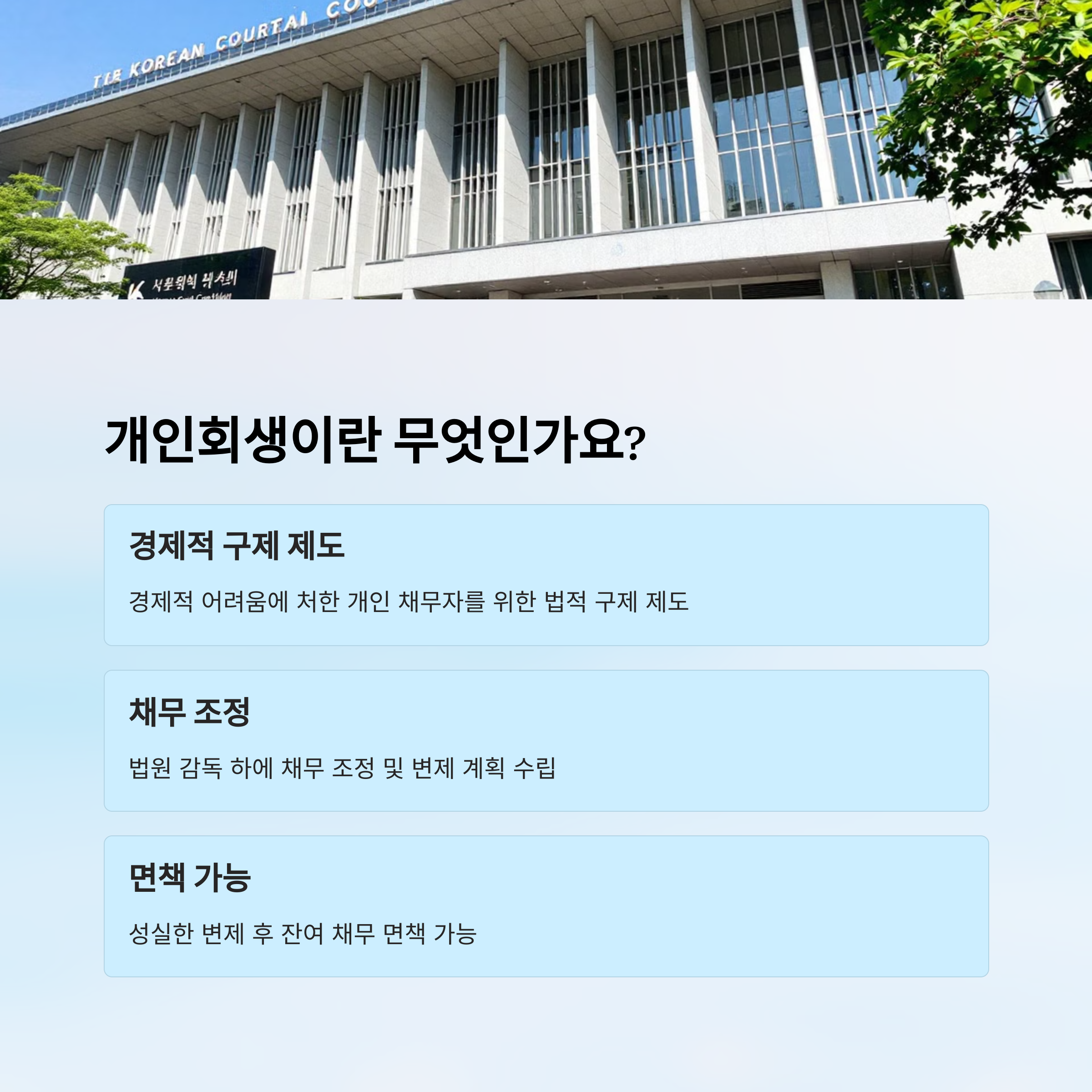 개인회생은 과도한 채무로 인해 정상적인 경제생활이 어려운 사람이 법원의 도움을 받아 채무를 조정하고 일부를 탕감받는 제도예요. 단순히 빚을 갚지 않는 것이 아니라, 법적 절차를 통해 일정 기간 동안 일정 금액을 상환하고 나머지를 면책받는 방식이에요.