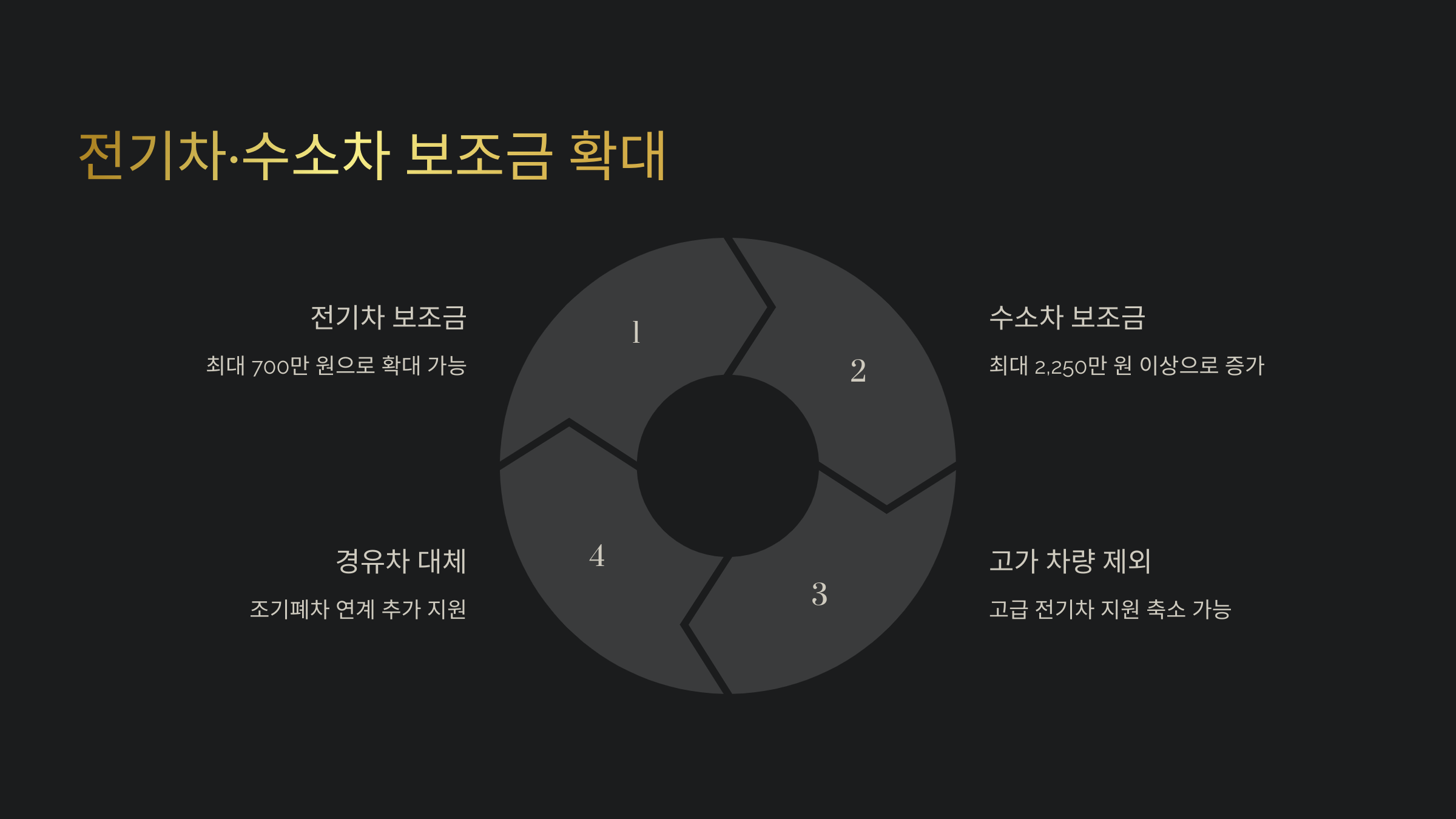 - ✅ 친환경차 전환 지원금 증가 (전기차·수소차 구매 시 추가 지원)