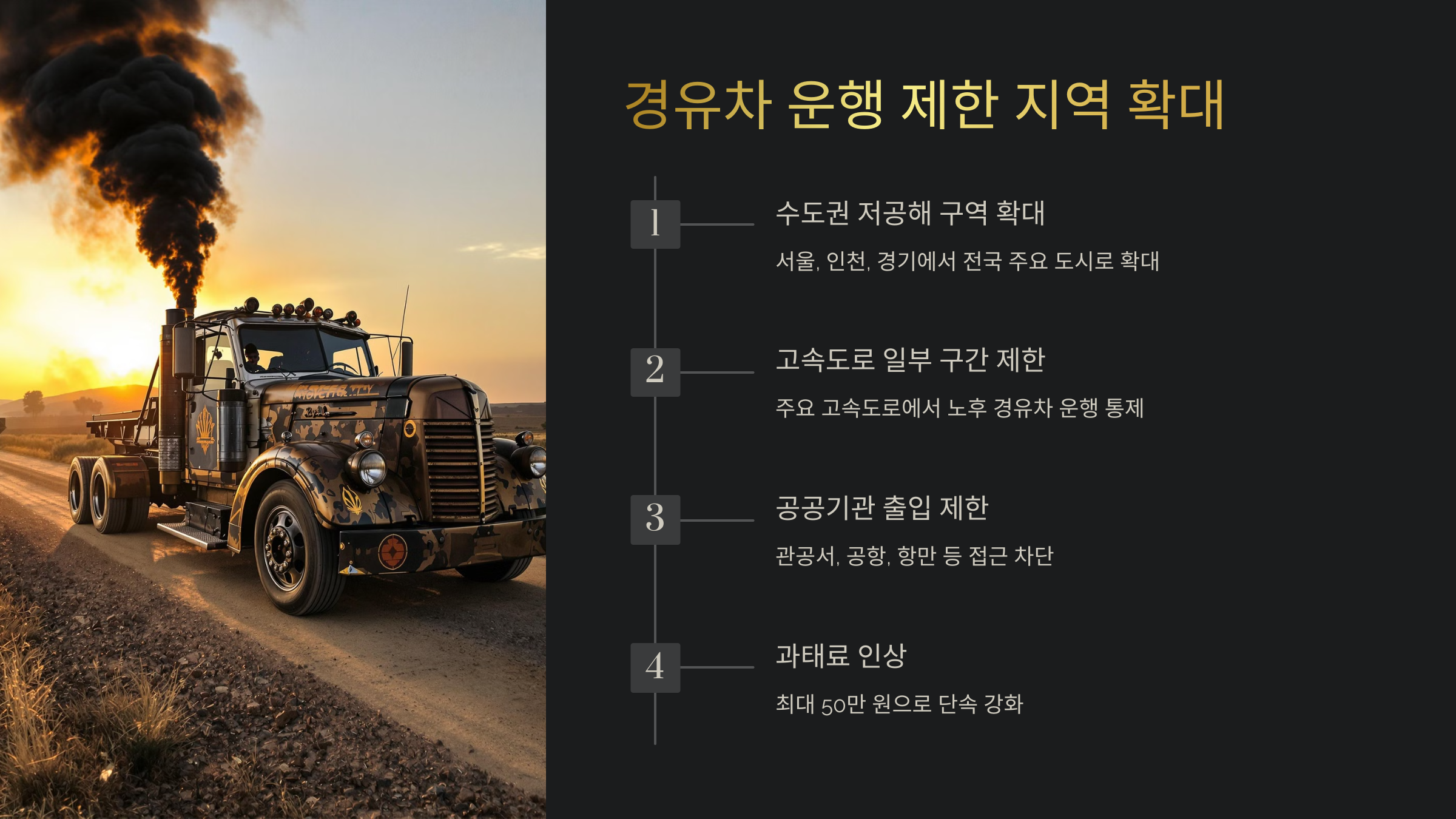 🚫 2025년부터 노후 경유차의 운행 제한 지역이 더욱 확대될 예정이에요. 대기오염을 줄이기 위해 정부는 기존 저공해 지역뿐만 아니라 전국적으로 운행 제한을 강화할 가능성이 커요. 🏭