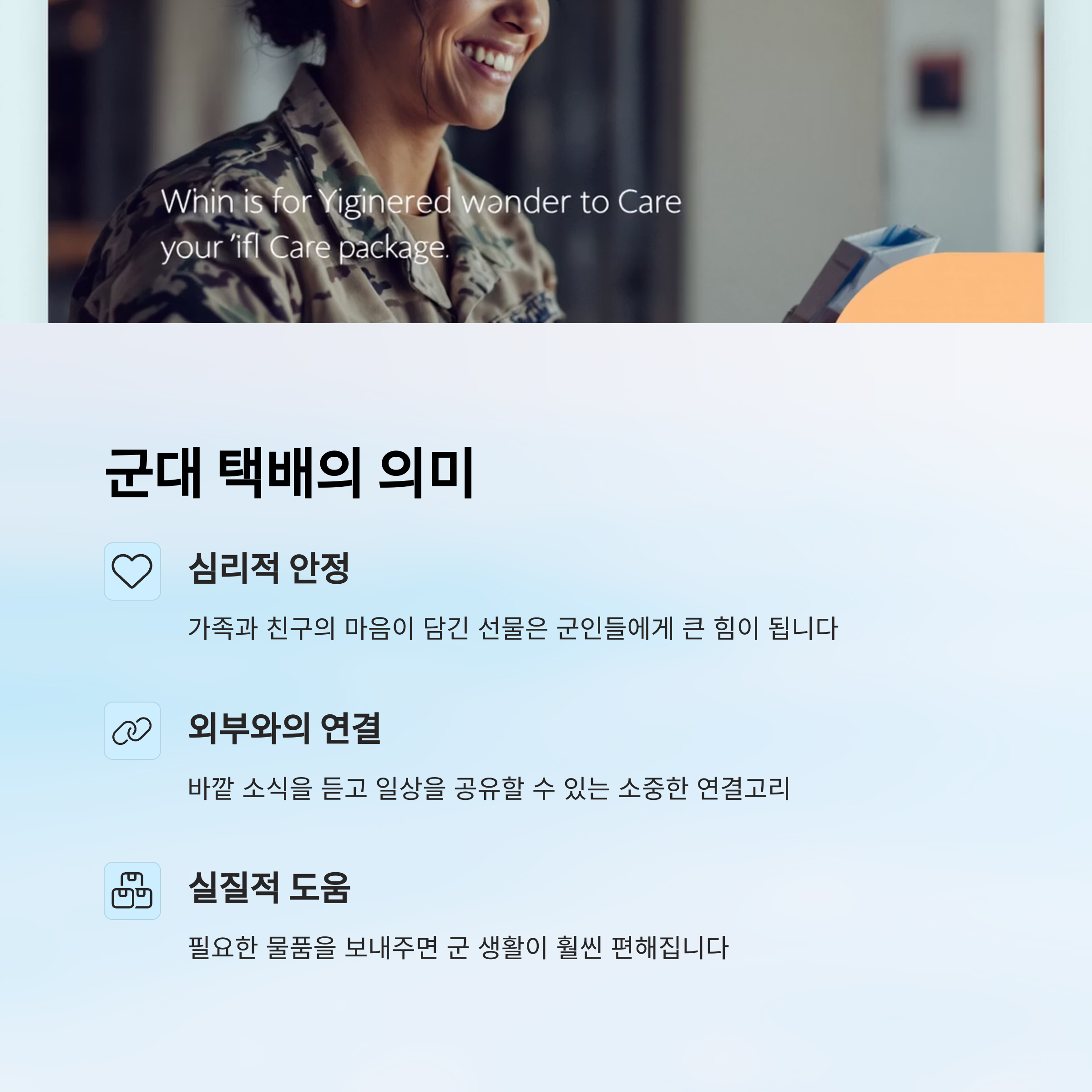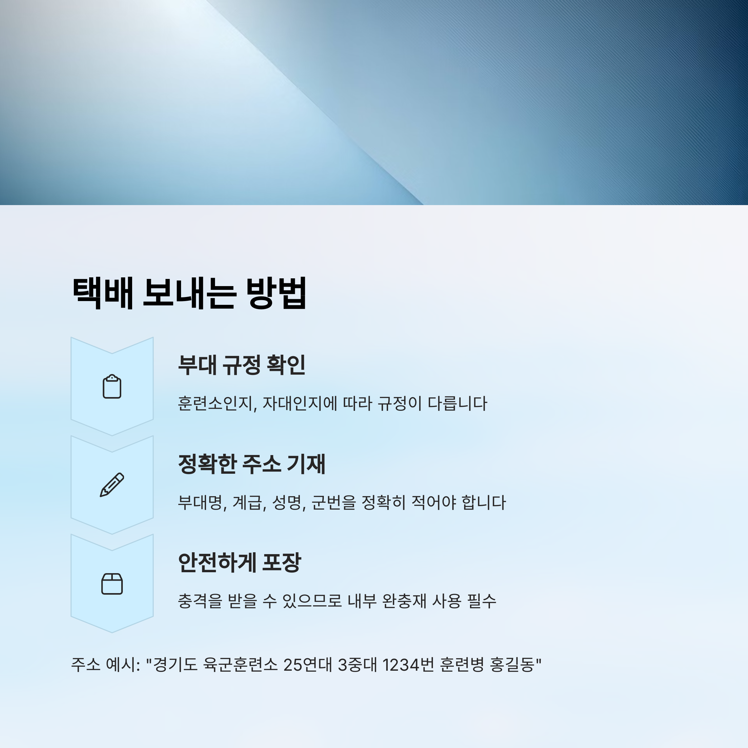 - 🚛 배송 업체 선택: CJ대한통운, 우체국 택배 등 군부대 배송 가능한 업체 이용.