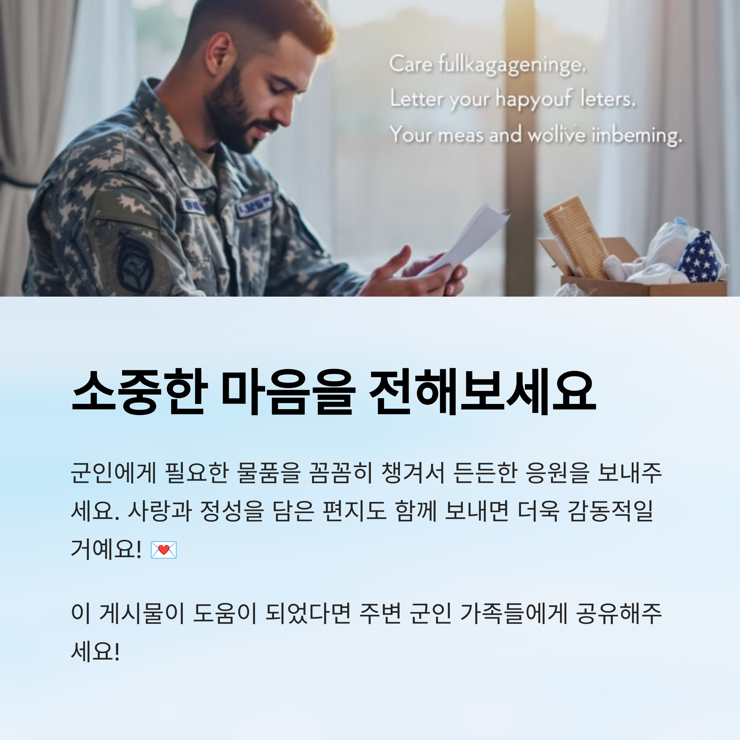 - 📞 보내기 전 군인에게 확인: 자대에 따라 허용되는 물품이 다를 수 있어요.