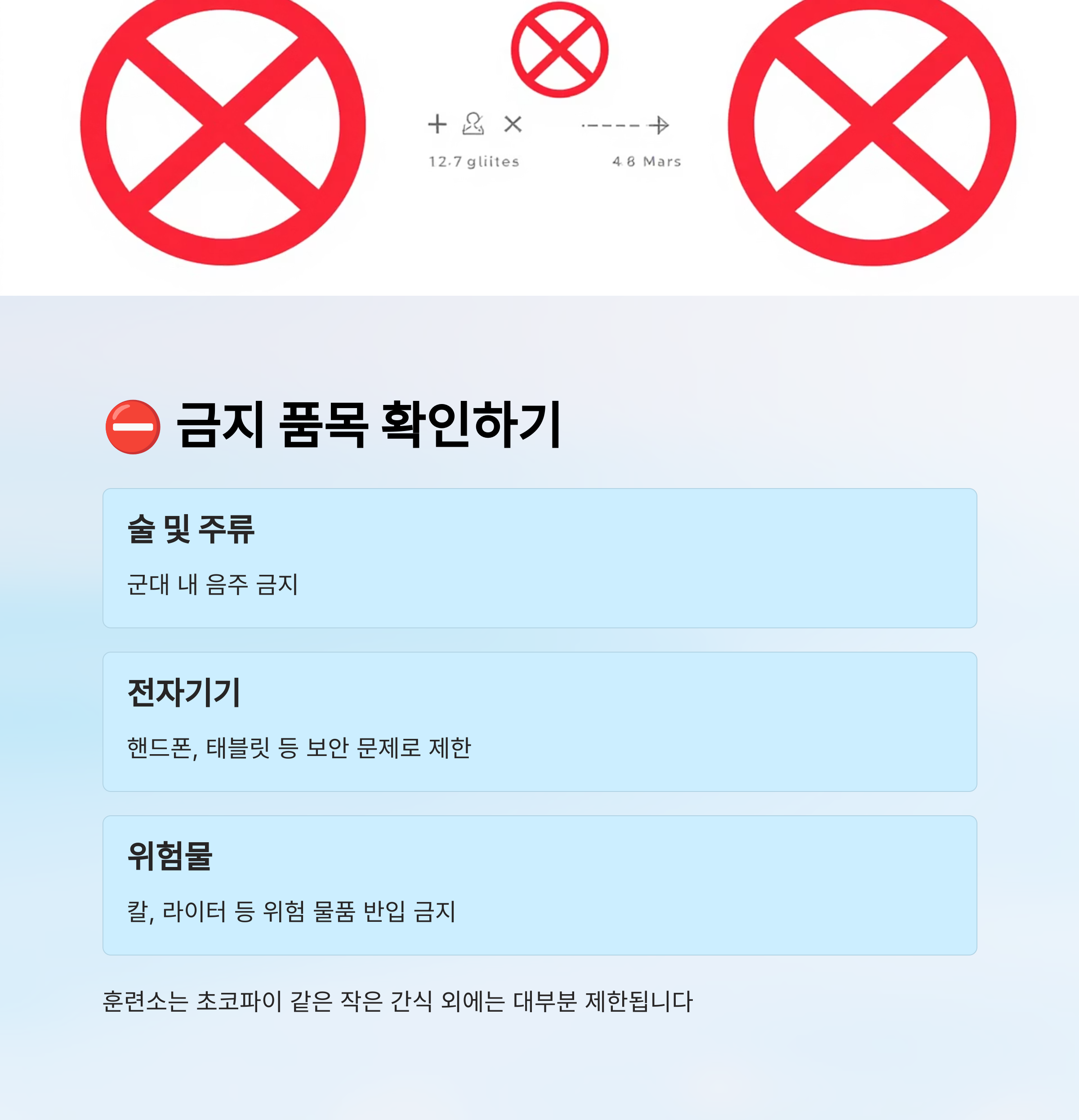 | 3. 금지 품목 확인 | 군대에서는 일부 품목(술, 전자기기 등)이 금지될 수 있음 |